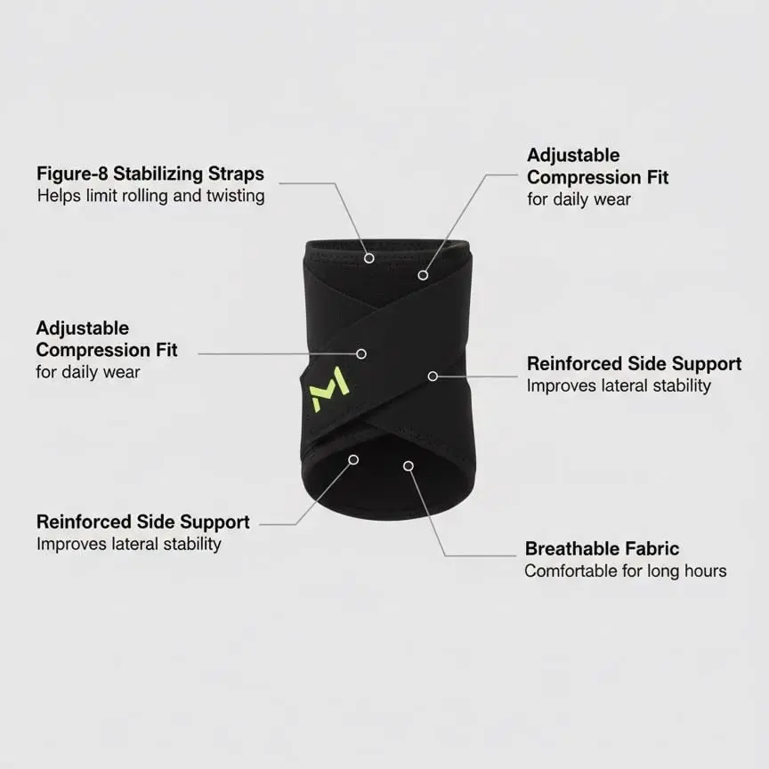 ·Secure Fit Inside Shoes: Figure-8 strap ankle stabilizer offers firm lateral support while fitting comfortably in most shoes, with durable breathable materials for all-day wear and adjustable left or right foot use