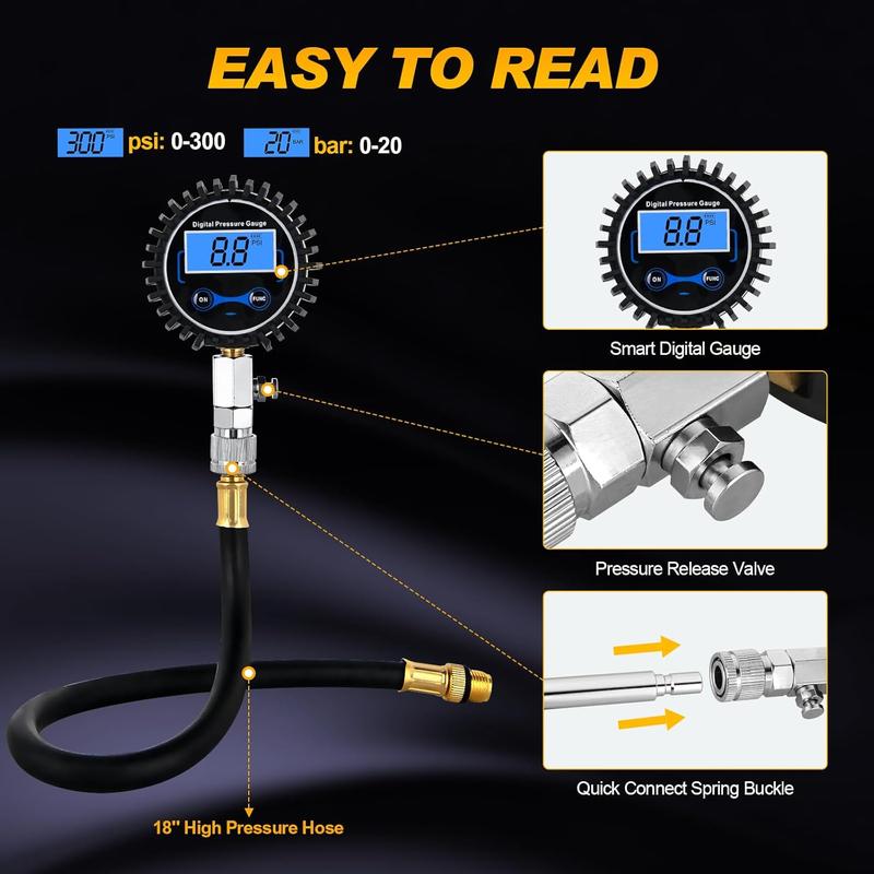 ·Digital Engine Compression Tester: It comes with 4 adapters for standard and specialty fittings, along with a 16-inch flexible hose gauge assembly equipped with a quick coupler, ensuring broad compatibility with petrol engines in motorcycles, cars, and trucks
