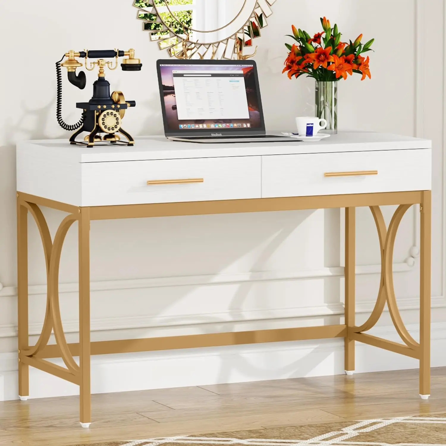 Experience a spacious office environment with this computer desk. Featuring two large-capacity drawers for privacy and generous legroom for comfort, it's perfect for tall individuals. The modern and simple style, with a white tabletop and gold X-shaped table frames, adds a touch of luxury to any home or office. Designed for durability, it's crafted with high-quality MDF and heavy-duty steel frames, supporting up to 154 pounds. This multifunctional desk can serve as a computer desk, makeup desk, study desk, workstation, or entryway console table. With easy assembly and a 360-day warranty, you can buy with confidence and enjoy friendly customer service.
