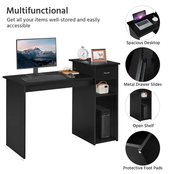 2. Functional computer desk: Featuring a spacious tabletop, a smooth-sliding drawer, a CPU stand and a storage shelf, this versatile computer desk can serve flawlessly as an office desk, a gaming station in your home office, bedroom and study. It also works great in offices or stores.