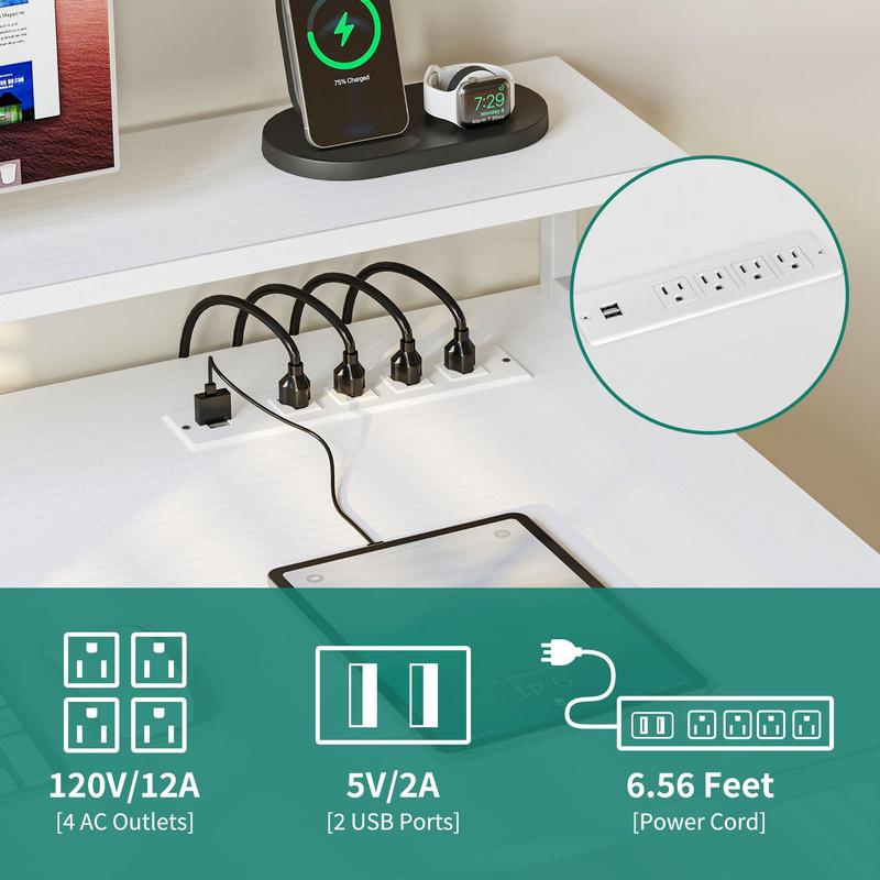 Office Desk with Drawers: DWVO computer desk with storage shelves is equipped with 2 USB ports, 4 AC & a 6.56ft power cord to charge your laptop, tablet and other devices, making your life easier.