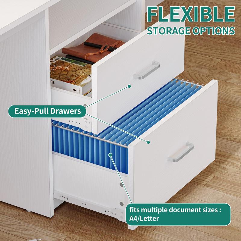 Ample Storage Capacity: To maximize your space and keep everything within reach, the computer desk offers ample storage, with 2 drawers (the file drawer for letter/A4 size files), storage shelves, and full monitor stand. Spacious tabletops(55" x 19.7") and monitor stand hold 2 monitors and other essentials for home office work and other activities.