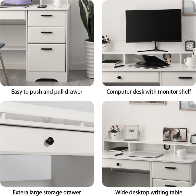 ·【Large Storage Desk】: The computer desk with drawers is equipped with 4 drawers for placing office documents. bottom shelf for your books,Desk with hutch can place your laptop and monitor, this will protect your neck so you don't have to slouch over the computer, and the rounded corners will protect your arms while you use them., and provide you with a larger and more comfortable working space.