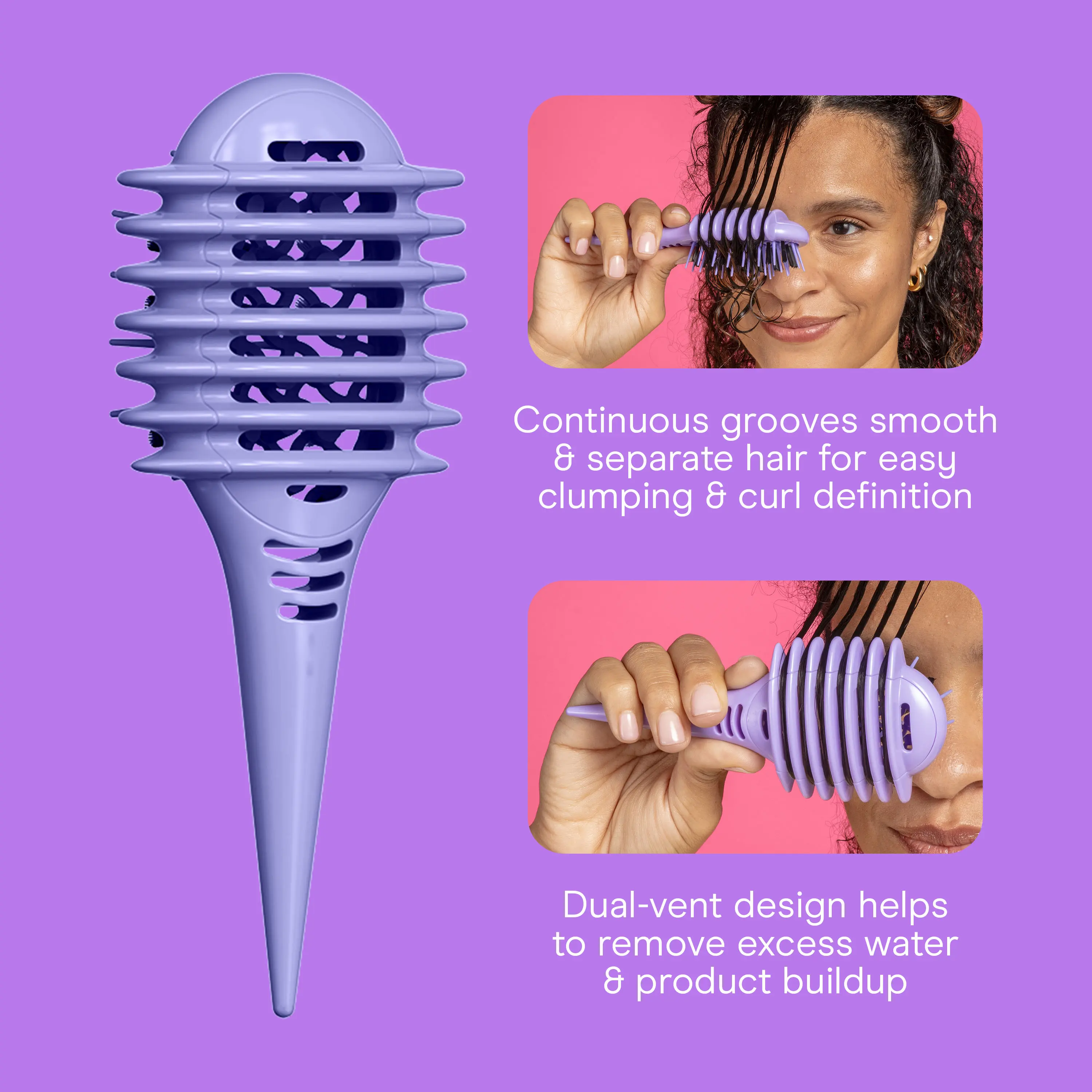 Create soft, bouncy definition with a compact detangling brush designed specifically for looser curl patterns and waves. Shapes and enhances natural texture without disrupting curl formation.