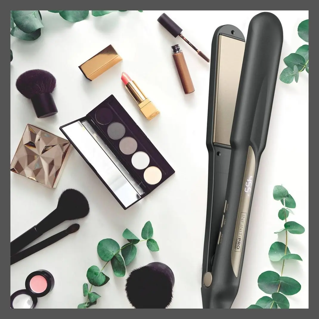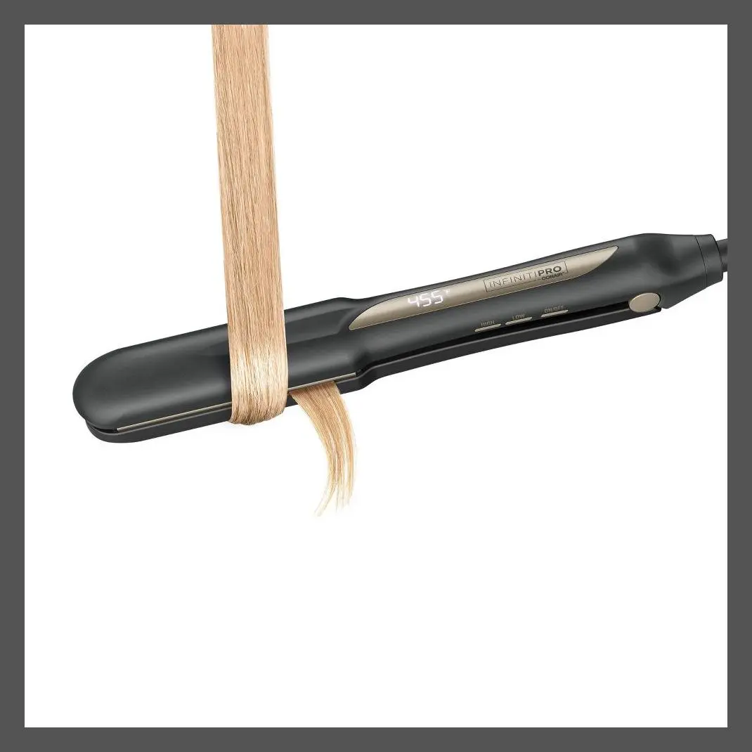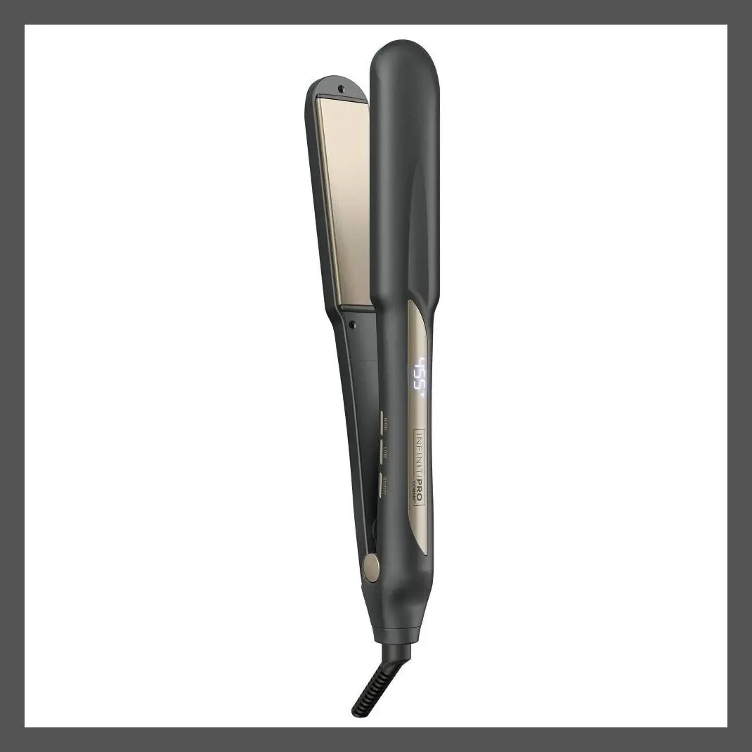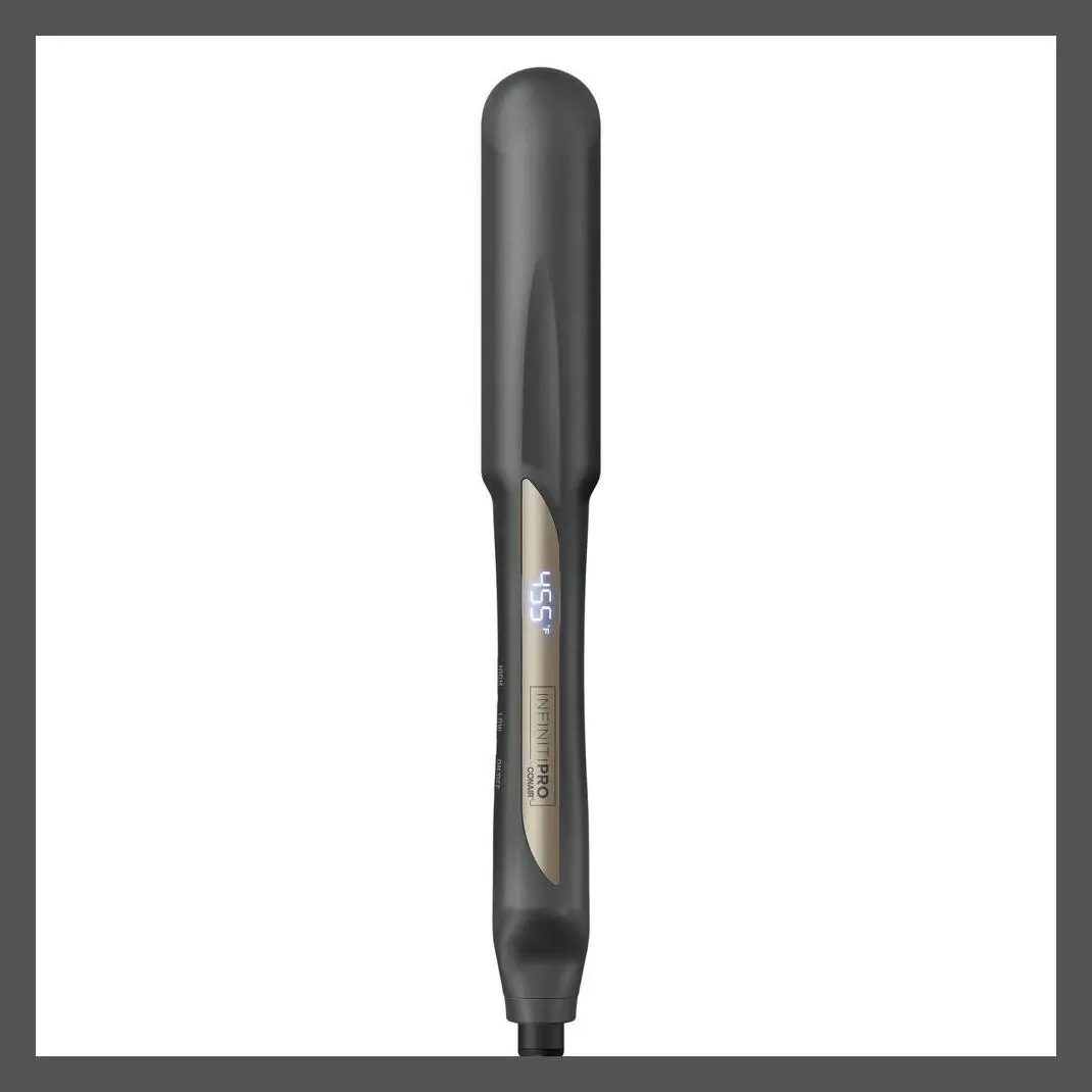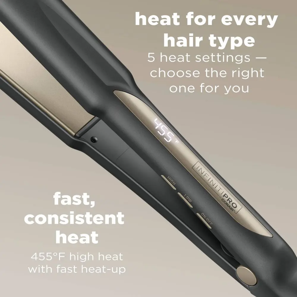 Smooth and shine. Straighten or curl. Get polished, professional results. Do it all, quickly and easily, with the InfinitiPRO by Conair 1¼" Tourmaline Ceramic Flat Iron. Designed with a floating plate that adjusts to your hair's texture, this styling essential features ionic technology to reduce frizz and give you shiny, manageable results with just one pass. The true ceramic heater heats up in 30 seconds and generates consistent heat for a flawless finish as soon as it reaches a stabilized temperature. The temperature select buttons and digital LED display make it easy to customize heat for your hair type. Choose from 5 heat settings up to 455°F. With such a wide range of heat options, there's a setting for every hair type and texture. The InfinitiPRO by Conair 1¼" Tourmaline Ceramic Flat Iron features sophisticated but simple-to-use technology that makes exploring a wide variety of looks effortless. Natural ions from tourmaline ceramic ensure less frizz and more shine, so your hair is always healthy looking with a fresh-from-the-salon finish. Have thick, hard-to-style hair? No problem. Up to 455°F ultra-high heat gets the job done, so you can create on-trend looks with ease. For expert straightening made simple, use a comb as a guide to separate hair strands and get better, even heat contact. This versatile tool from InfinitiPRO by Conair puts the power to get creative and express your own personal style in the palm of your hand.