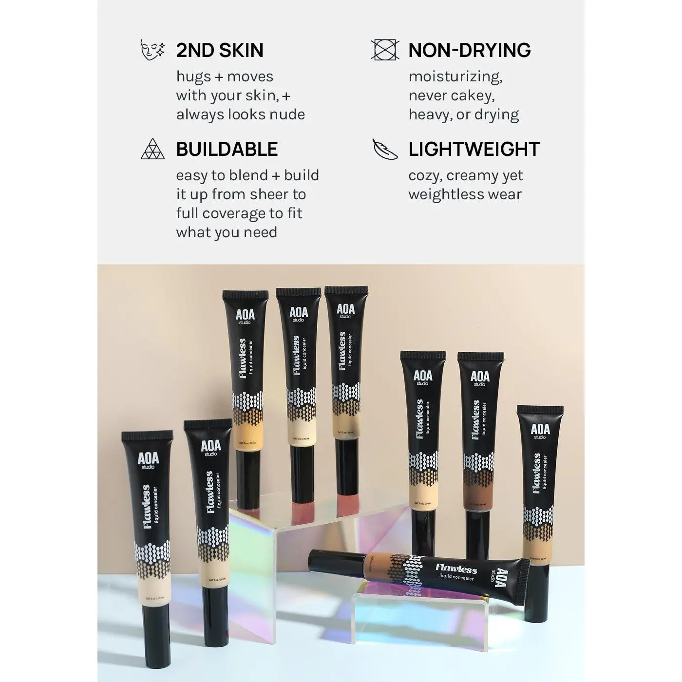 AOA flawless liquid concealer is lightweight and easy to build to medium coverage with a few drops! It’s so good for everyday makeup preferably if you want a natural look,rather than heavy full coverage…