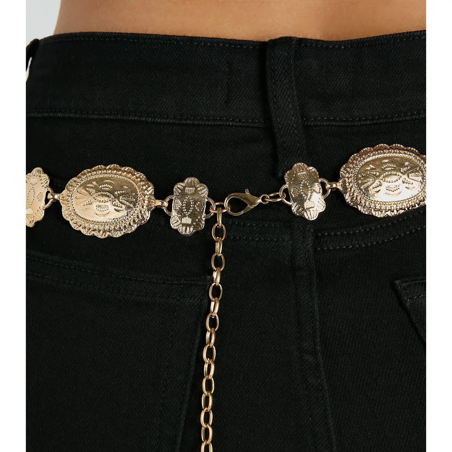 Saddle up with this playful etched concho belt, featuring an adjustable lobster clasp closure. Wrangle up some Western vibes and complete the look in denim shorts for a festival or concert!