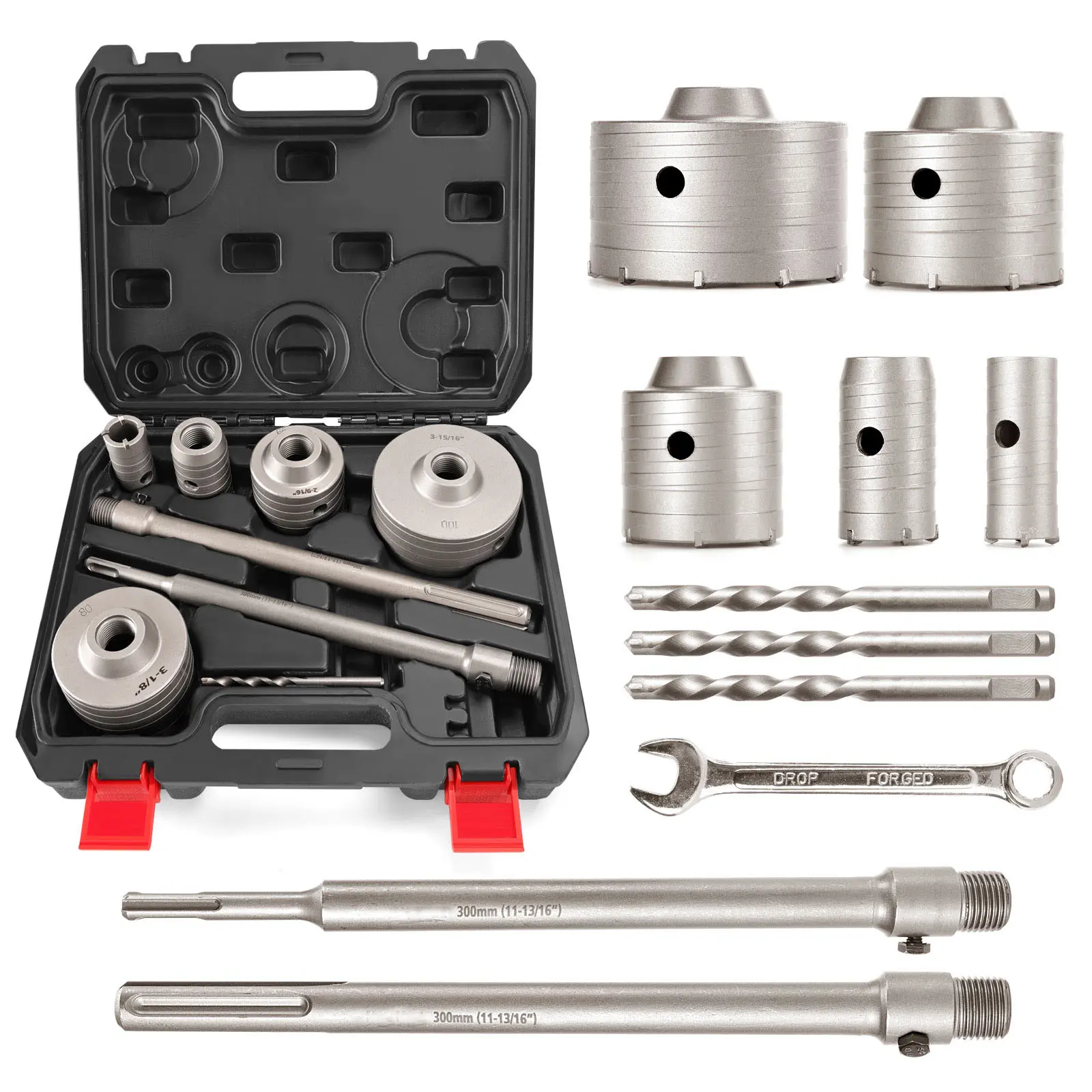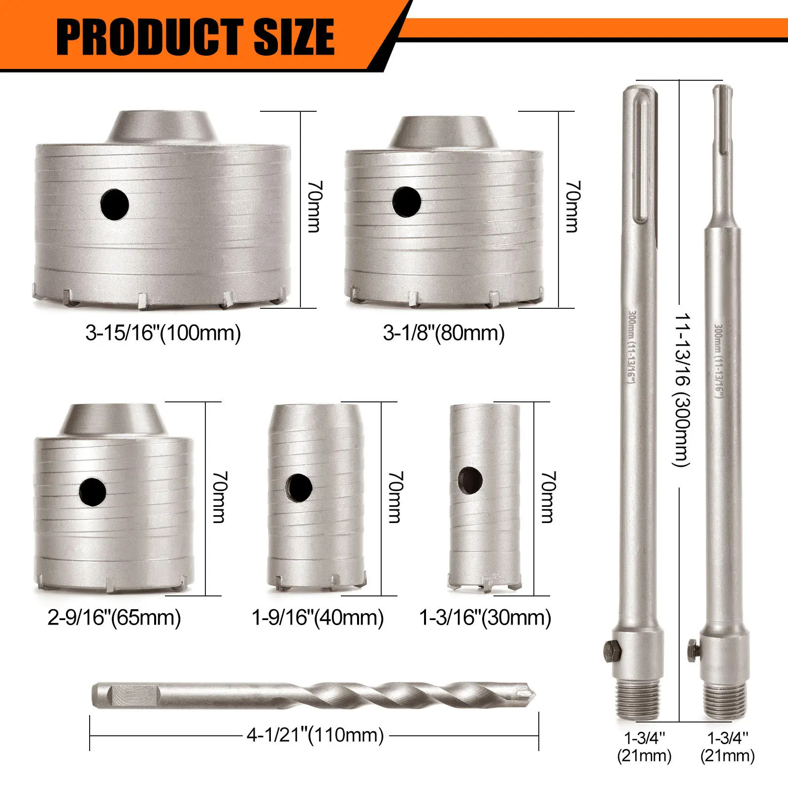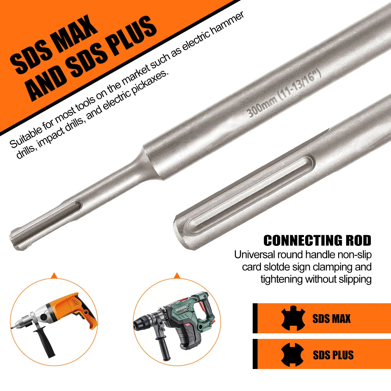 Includes SDS Plus and SDS Max adapters (300mm/11-13/16"). Fits most hammer drills, impact drills, and electric picks. Penetrates thick walls for installing AC ducts, vents, water heaters, pipes, etc. (Tip: Clear debris periodically to deepen holes).