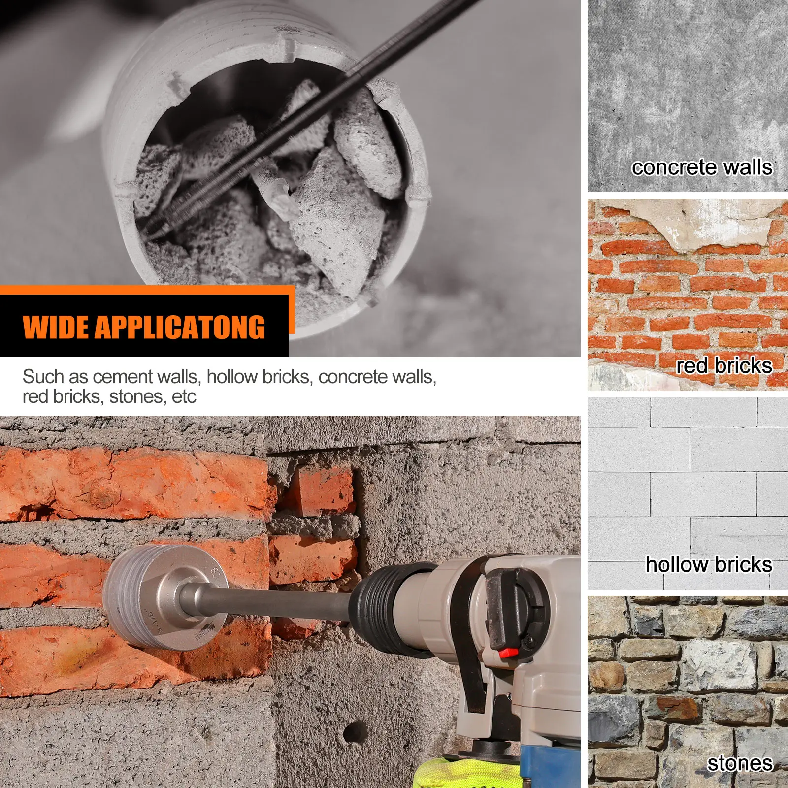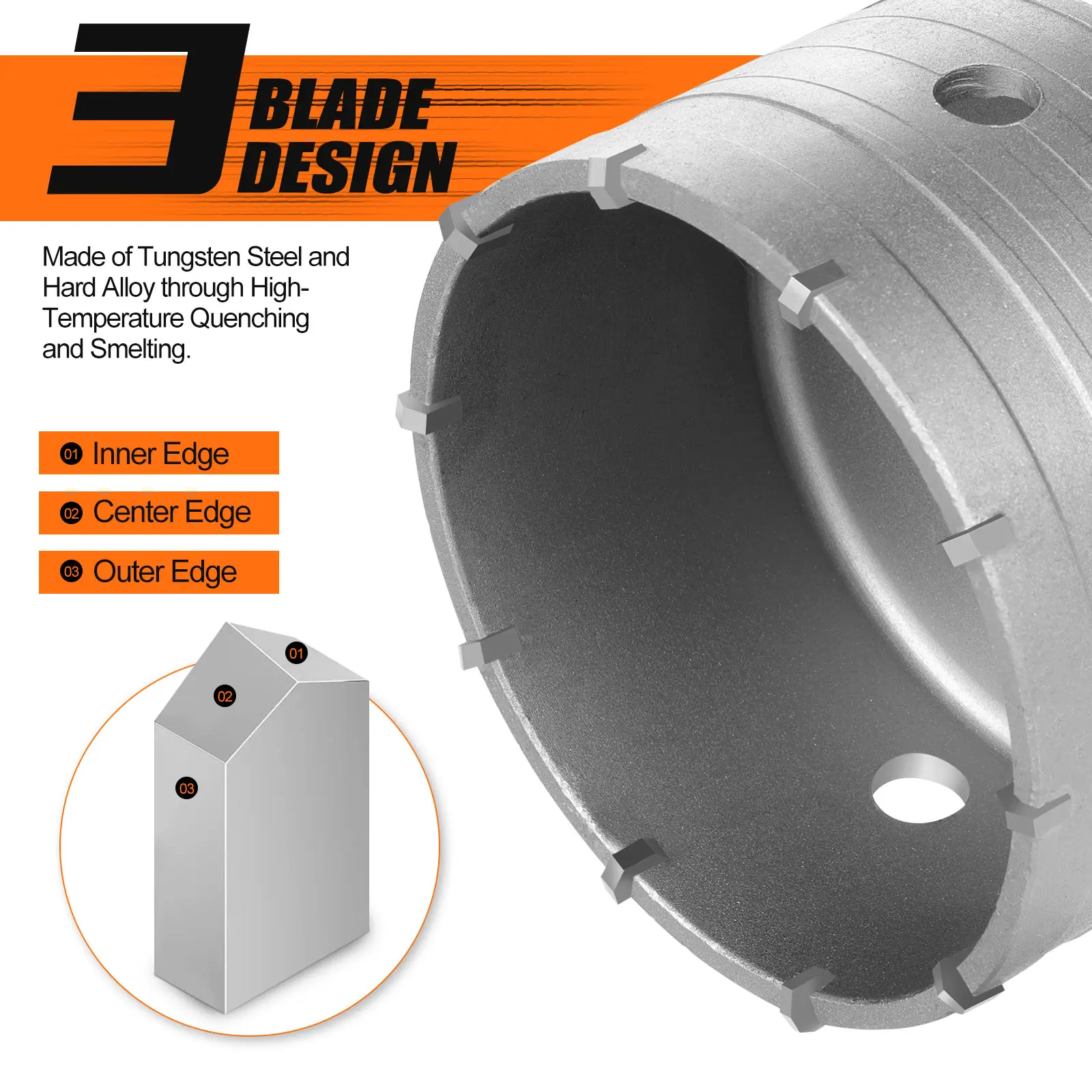 Features a unique three-blade system (inner/outer/center edges) with serrated teeth for aggressive cutting. Neat blade spacing and integrated dust removal slots prevent clogging during drilling, boosting efficiency. Ideal for cement walls, hollow bricks, concrete, red bricks, and stone.