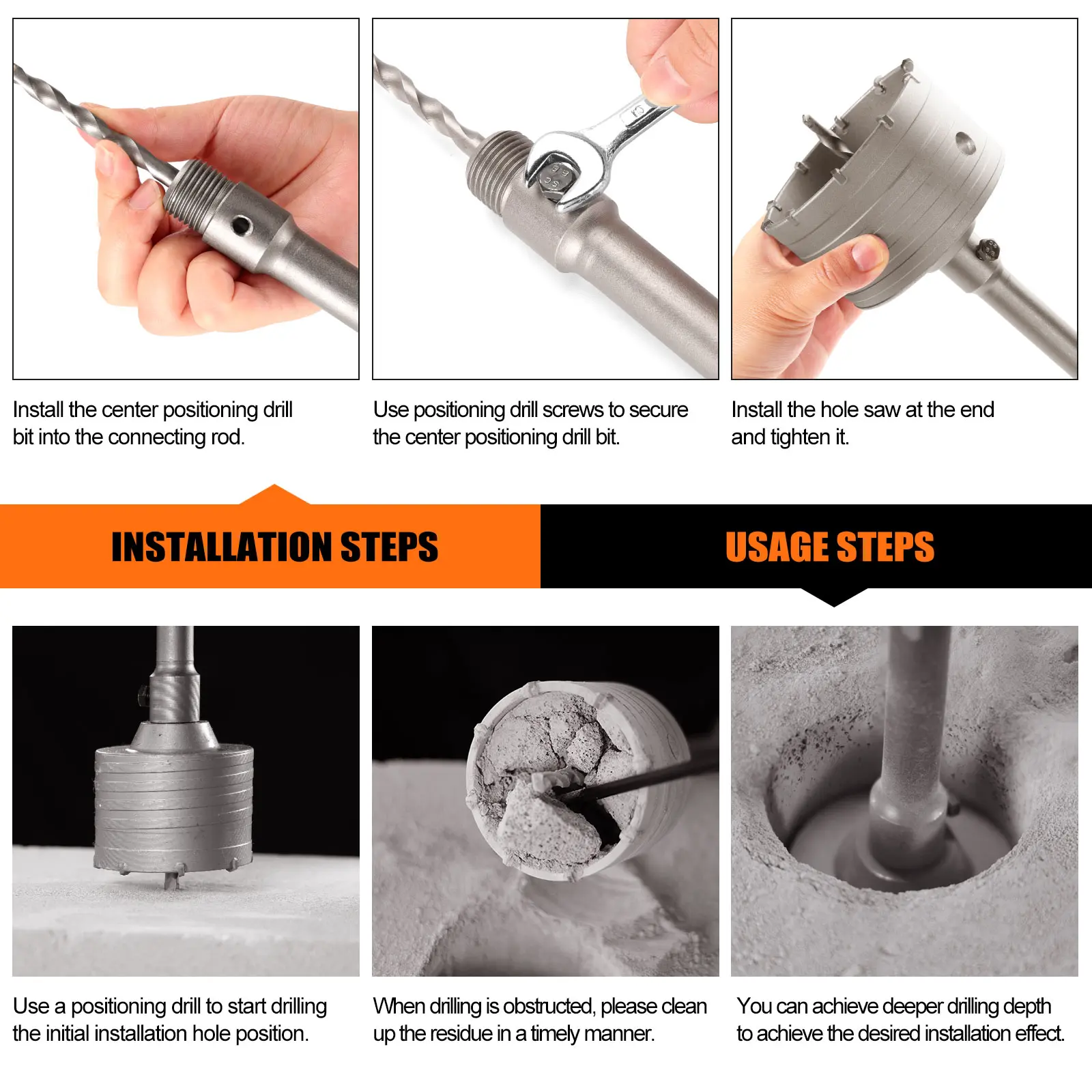 Made of tungsten carbide through high-temperature quenching, this 5pc concrete hole saw set delivers exceptional hardness, durability, and rust resistance. The corrosion-resistant surface and sharp tungsten carbide teeth ensure high-precision, smooth cutting with stable, fast drilling performance.