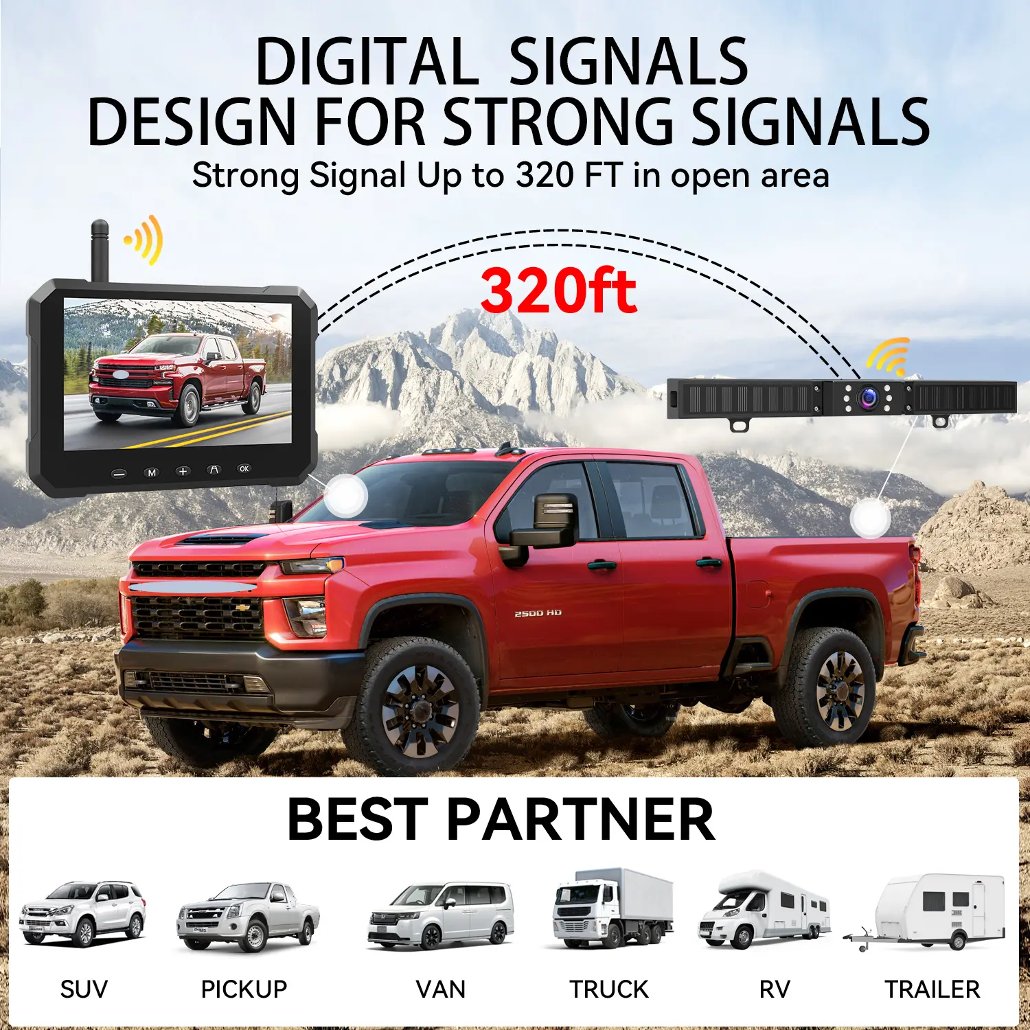 【Powerful Digital Signal】The wireless backup camera for car features a built-in, high-performance digital receiver with cutting-edge wireless frequency hopping technology, ensuring strong anti-interference capability. Enjoy seamless, lag-free images with no dropped frames or delays. The wireless signal reaches up to 150 feet(unobstructed open space) for cars, small vans, SUVs, trucks, sedan and trailers.