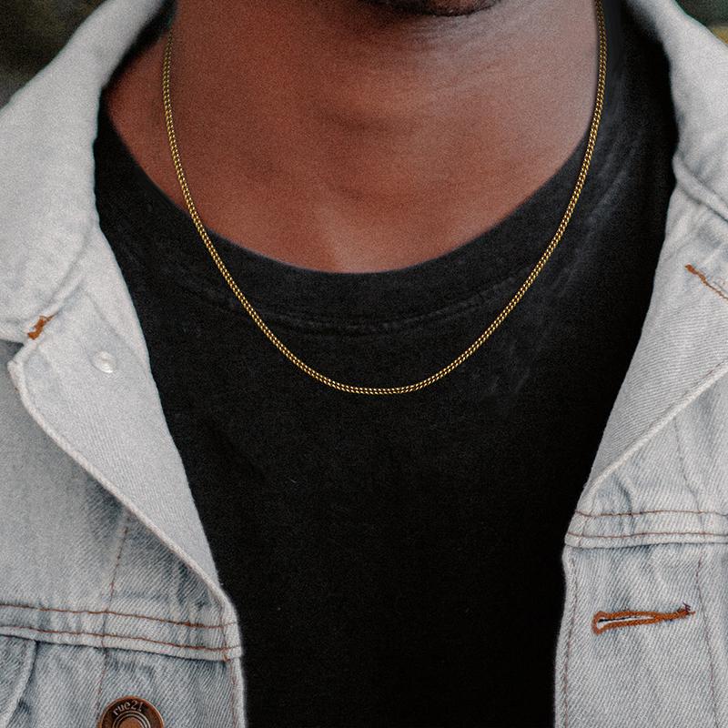 ·The Connell is light, understated and perfectly paired with any piece of choice. If you’ve never worn a chain before, opt for something small and classic that does not sit too heavy on your chest. Choose a plated metal base so it does not tarnish your clothing or leave you with a green mark.