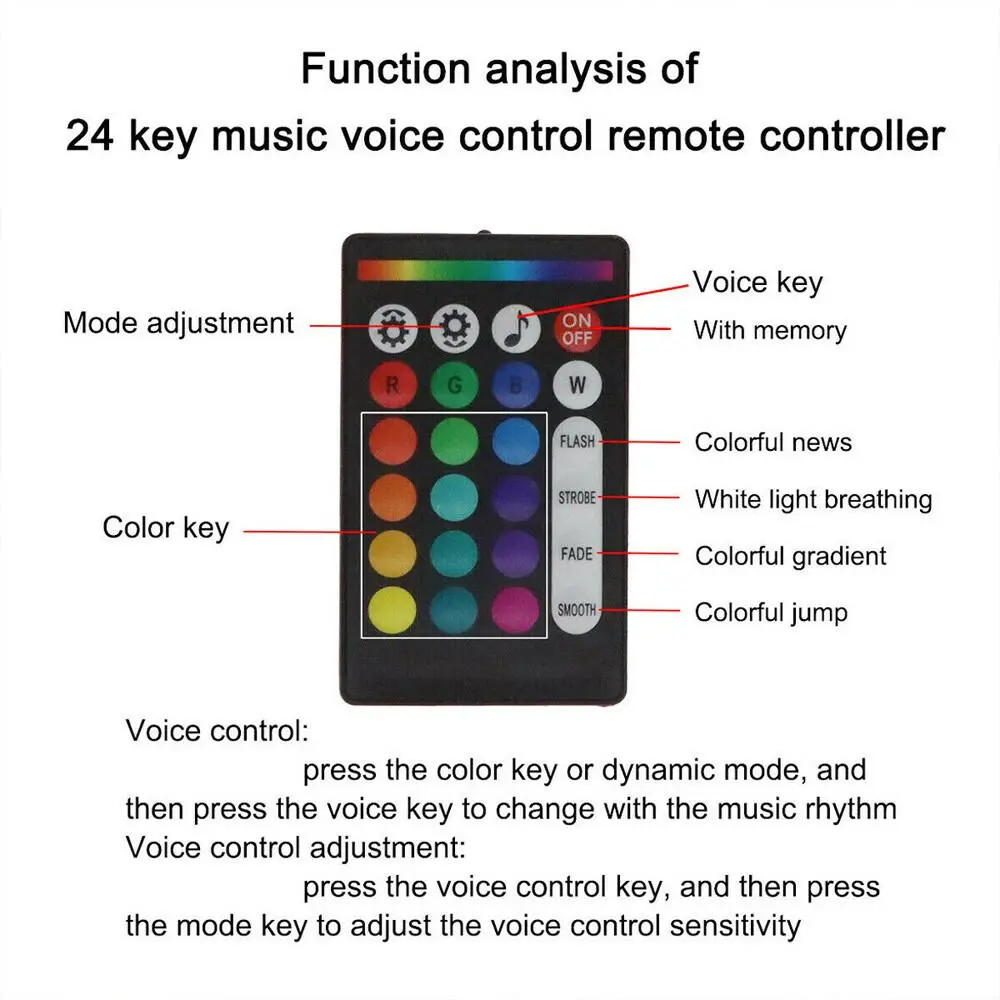 ·Remote Control Change Modes:Static 16 colors (red, green, blue, yellow, mixed white, pure white, cyan, purple, etc.)and RGB light change, fade, jump, spark, and adjust brightness, mode speed, and sound sensitivity adjustment