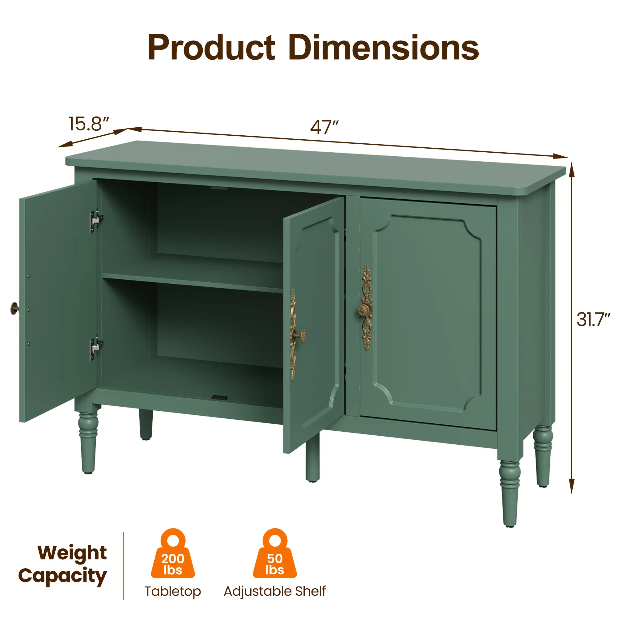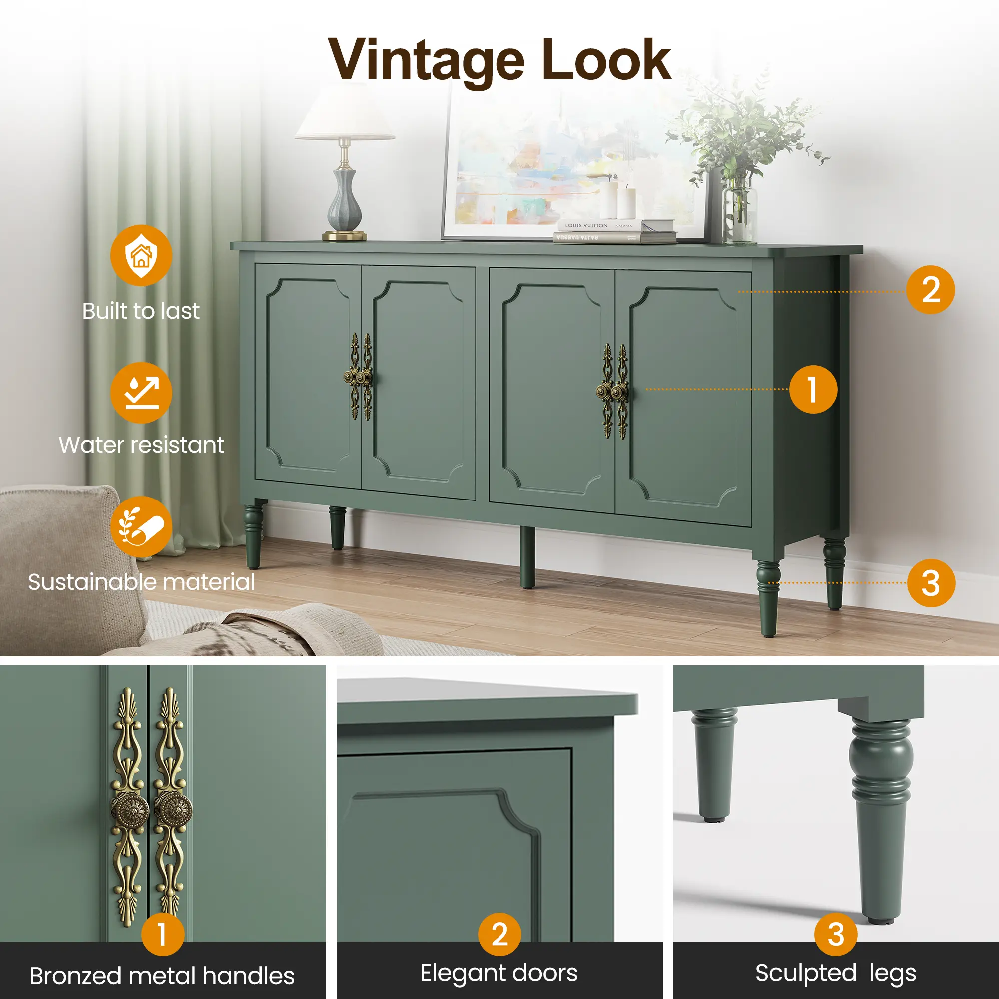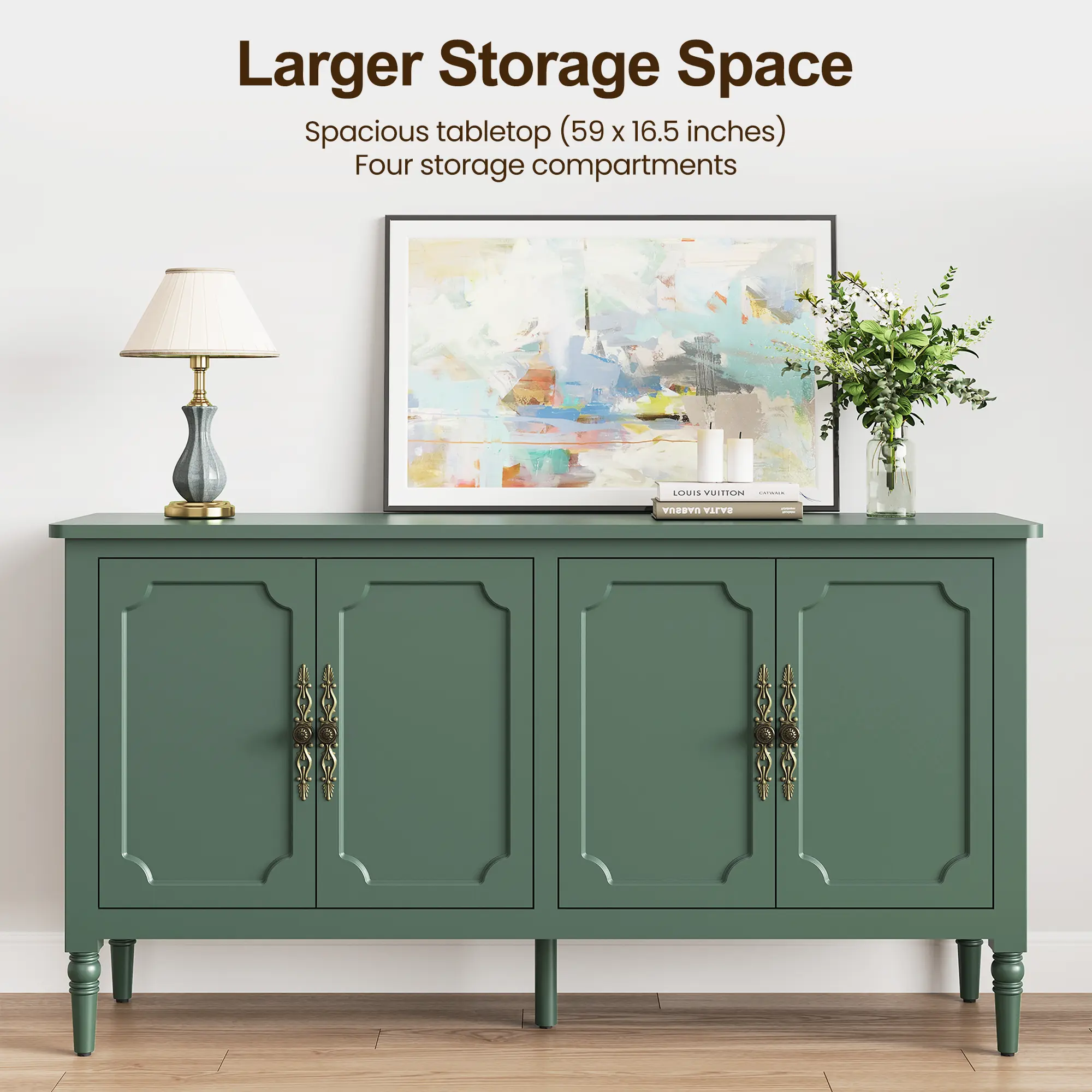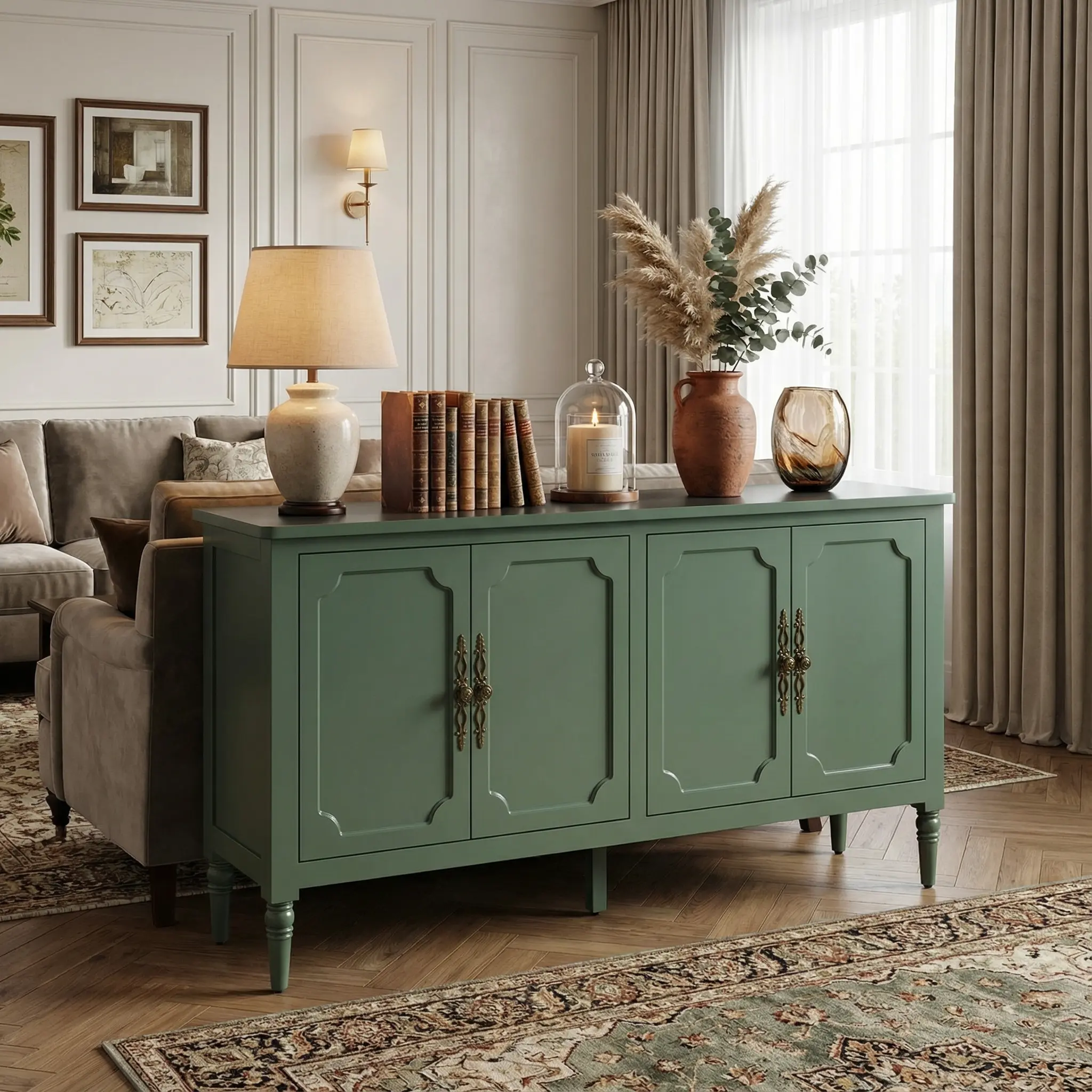 Β·γExuding Elegance & Sophisticationγ This decorative cabinet features intricately carved antique bronze handles paired with graceful solid wood legs. Enhanced by a smooth eco-friendly finish and rounded corner detailing, it embodies refined authority from every perspective - whether admired from afar or examined closely, effortlessly elevating your living space with timeless grace and noble charm.