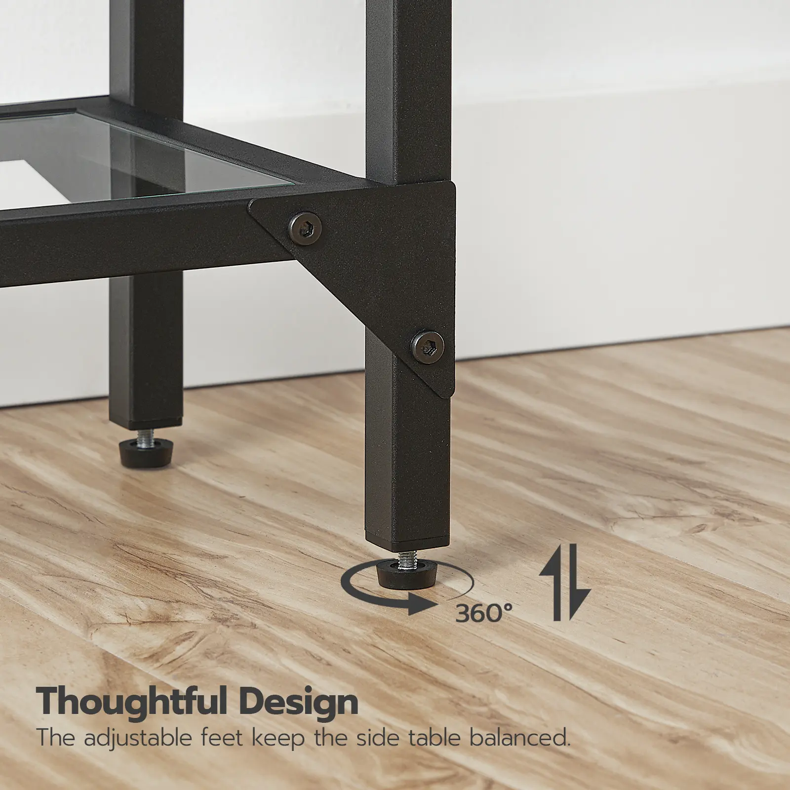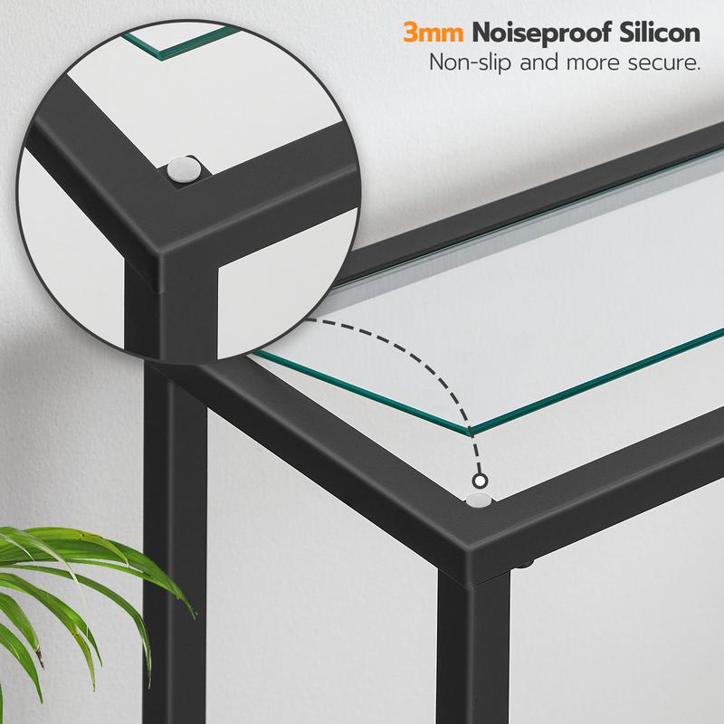 Let slightly uneven floors be a pain of a bygone time; with adjustable feet on each leg, this tempered glass console table keeps everything on it standing tall and steady.