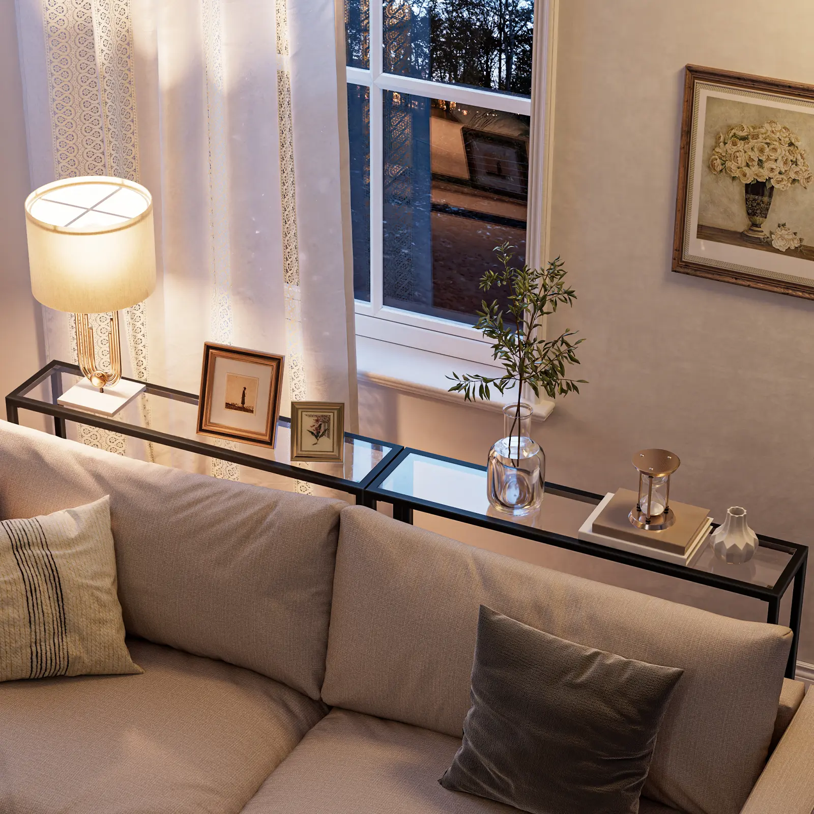 This sofa table has a simple construction.With transparent glass top and a streamlined frame, even if you are a novice, you can understand the assembly process at a glance.