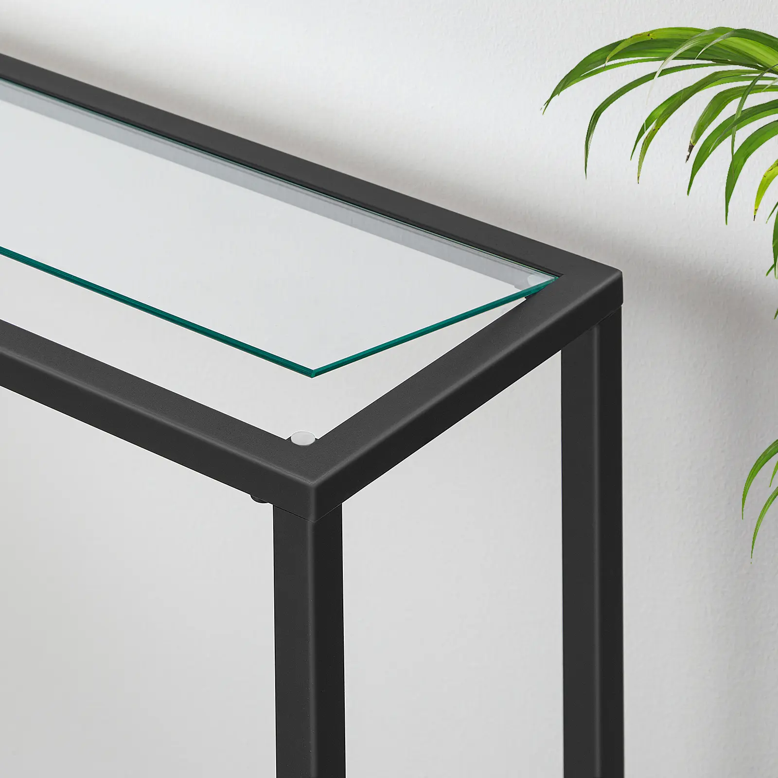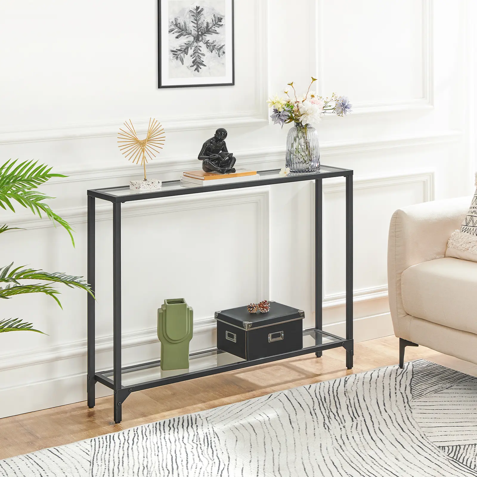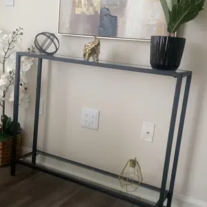 The combination of sedate and low-key black and pure transparent color not only reduces a sense of heaviness, but also take your home to the next level with a modern console table that unites sleek.