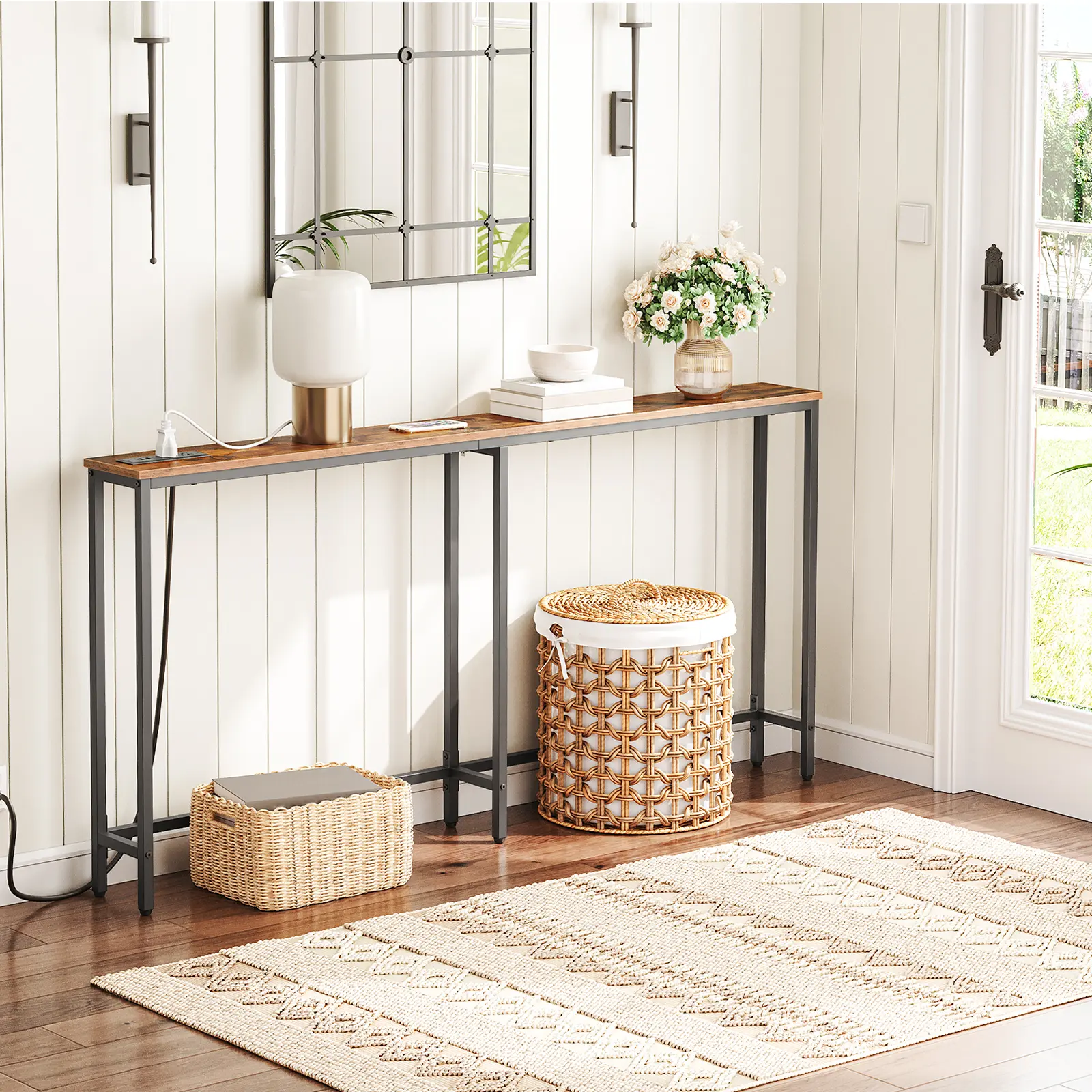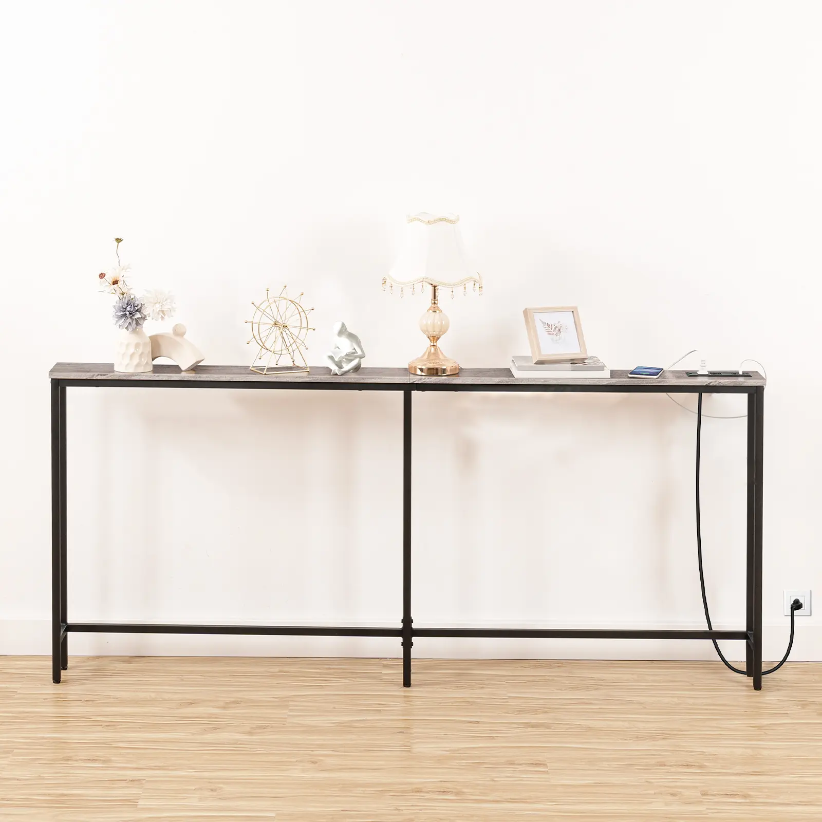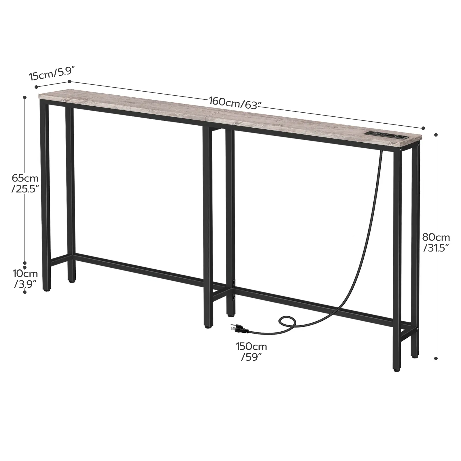 The narrow console table comes with built-in 2 plug outlets, 2 USB ports and a 59" power cord.