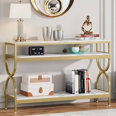 ·Modern yet Elegant Look: This console table exudes elegance and luxury with its white and gold color scheme and sleek design. The faux marble top adds a touch of sophistication, while the gold frame provides a striking contrast that catches the eye. Its classic yet modern look that will complement any decor style