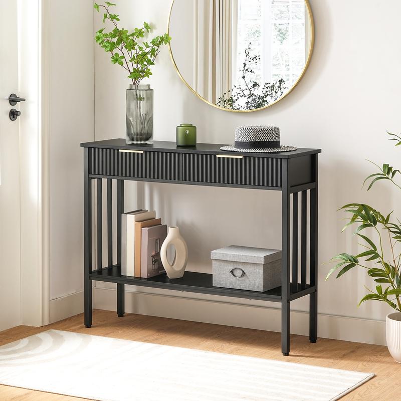 ·2-Tier Entry Table with Drawers: Two spacious drawers keep personal items like keys and headphones secure and organized. The open, generous top surface and bottom shelf offer extra space for everyday essentials, keeping everything tidy and in order