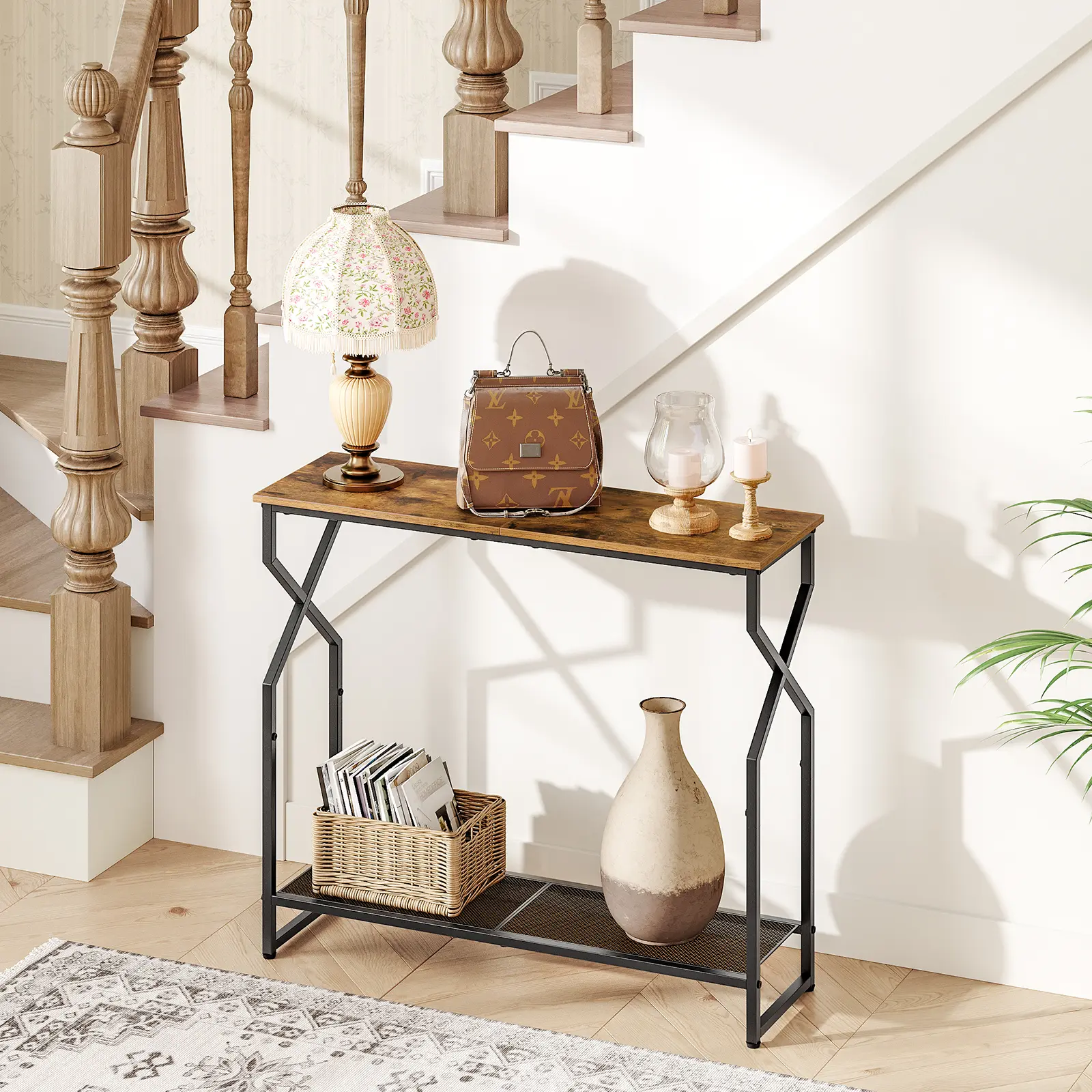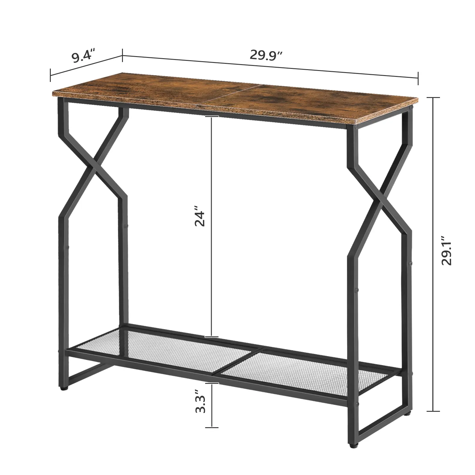 ·2-Tier Storage: The top of this sofa table is ideal for photo frames, plants, books, bags, and more. The lower mesh shelf is suitable for commuter shoes, storage baskets, and other items, ensuring organized and quick access to your belongings