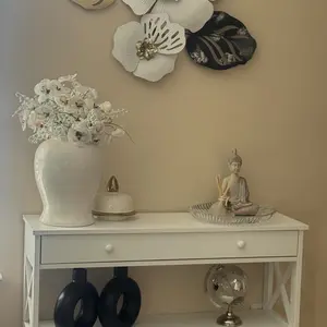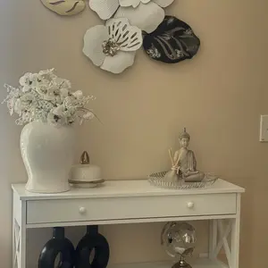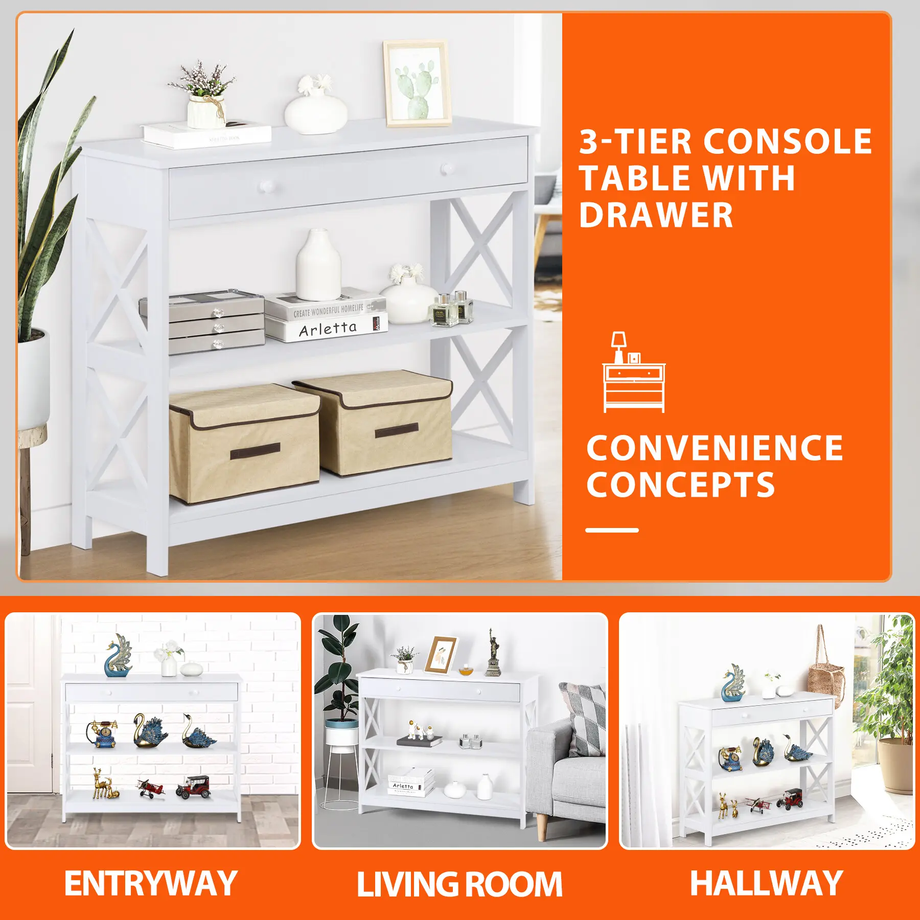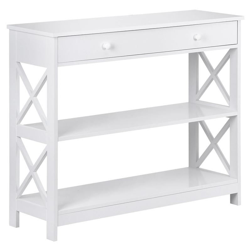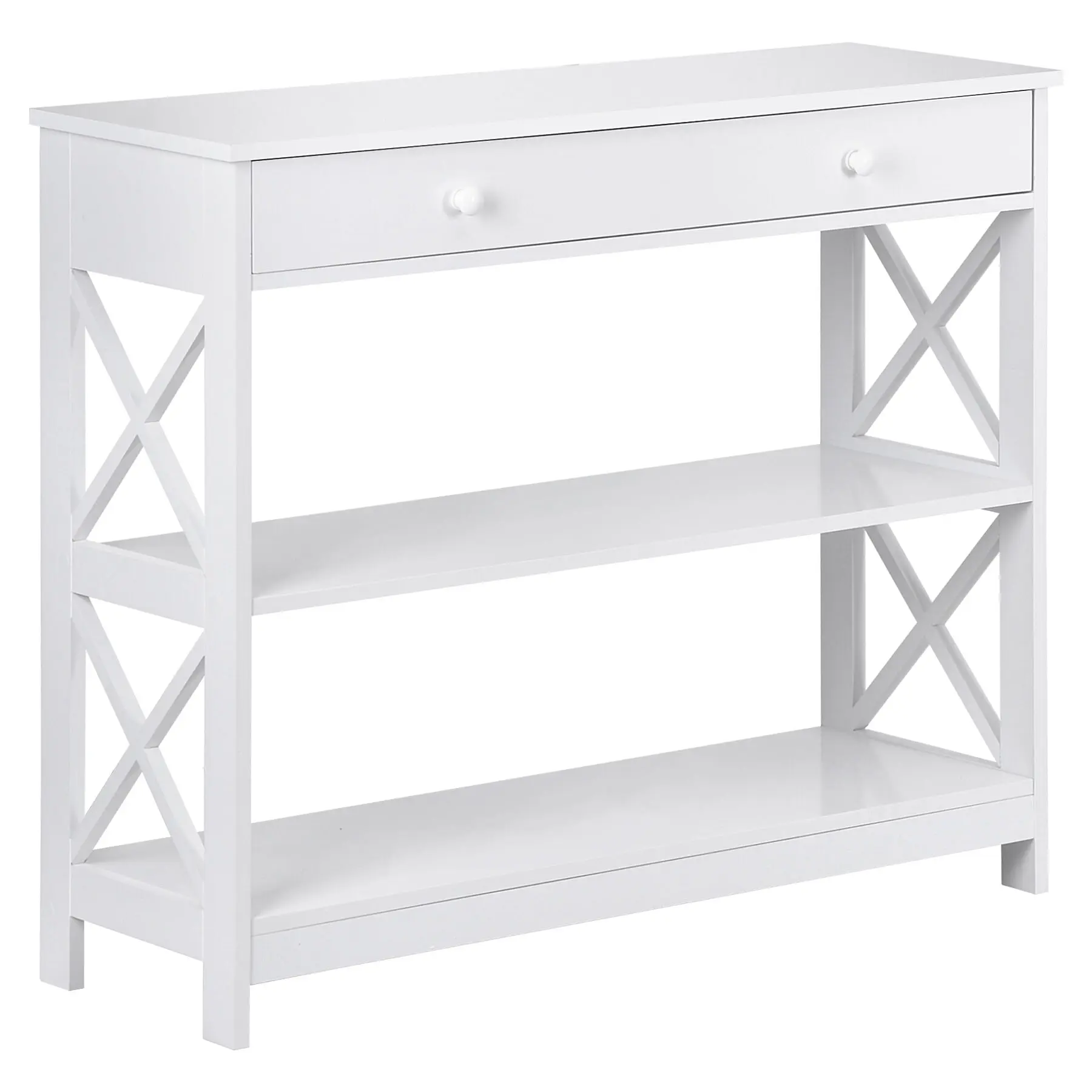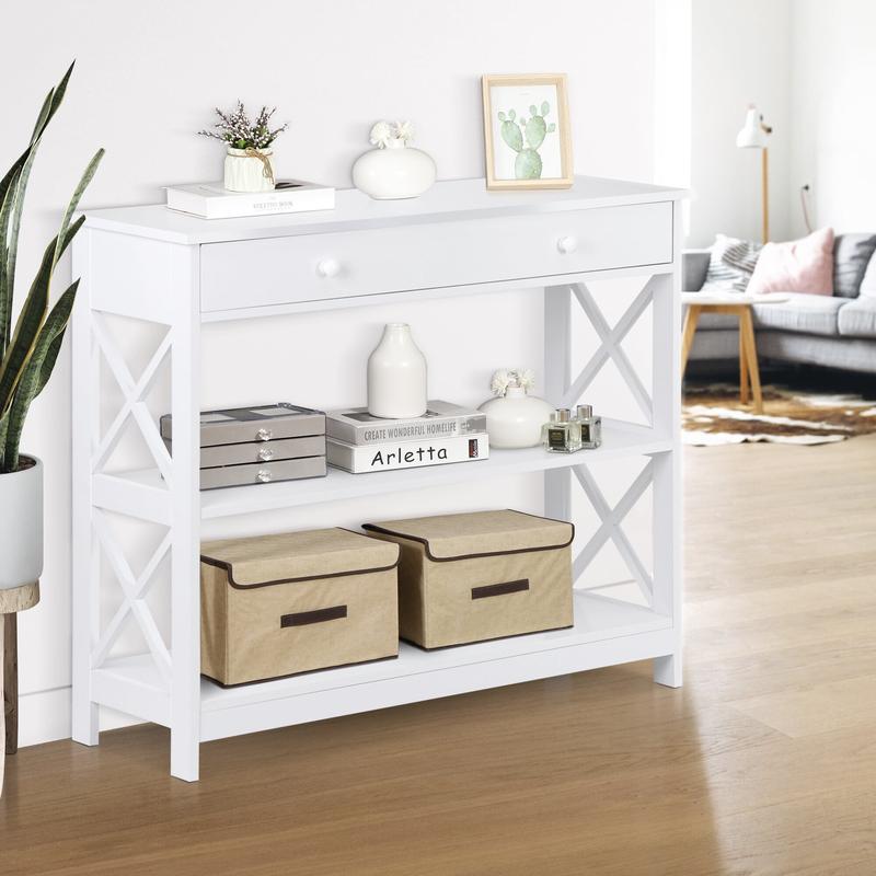 This console table is made of premium and solid MDF boards with a high-quality black powder coating that offers superb durability and stability for long-term use. Up to 55 pounds weight capacity of each shelf and the drawer is 22 pounds, let you can store and display a lot of items on it with no problem. The spacious drawer offers plenty of room to stow away entryway essentials and everyday necessities. A smooth yet textured espresso finish with its X design on the sides makes this accent entry table looks so elegant, let you be attracted by it.Heavy Duty & Durable: Constructed from premium MDF boards with a high-quality black powder coating for exceptional durability and stabilityClassy Design: Features a smooth yet textured white finish with an elegant X design on the sides, making it suitable for various home and office decor stylesAmple Space & Versatile Use: The 3-tier design includes 2 shelves and 1 drawer, providing ample storage and display space for keys, gadgets, and more Ideal for use as a console table, display table, or bookshelf in entryways, hallways, living rooms, bedrooms, and officesEasy to Assemble: Comes with detailed instructions and basic tools for straightforward assembly All parts and accessories are clearly listed for a step-by-step setupSpecifications:Color: WhiteMaterials: MDFOverall Dimensions: 39 4" x 11 8" x 31 7" (L x W x H)Weight Capacity: Max 55 LBS/ShelfShelf Distance: 10 43"Net Weight: 42 11 LBS