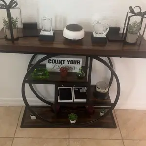 ·INDUSTRIAL Style- The 41.3" console table with a circle base exudes industrial charm with its rugged and sturdy design. The rustic gray finish on the surfaces of shelves adds a touch of warmth and vintage appeal, and the middle two shelves are ingeniously placed within a large circular metal frame, making it a truly unique and eye-catching centerpiece in the hallway.