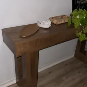 The material is light but solid, it was easy to put together, the instructions were clear. It looks great in my home at the main front door entrance, the finish is beautiful, I can’t wait to decorate the space. The only issue I have are the holes, which I’m not sure if there is something missing from the box, but I will contact the shop and find out.