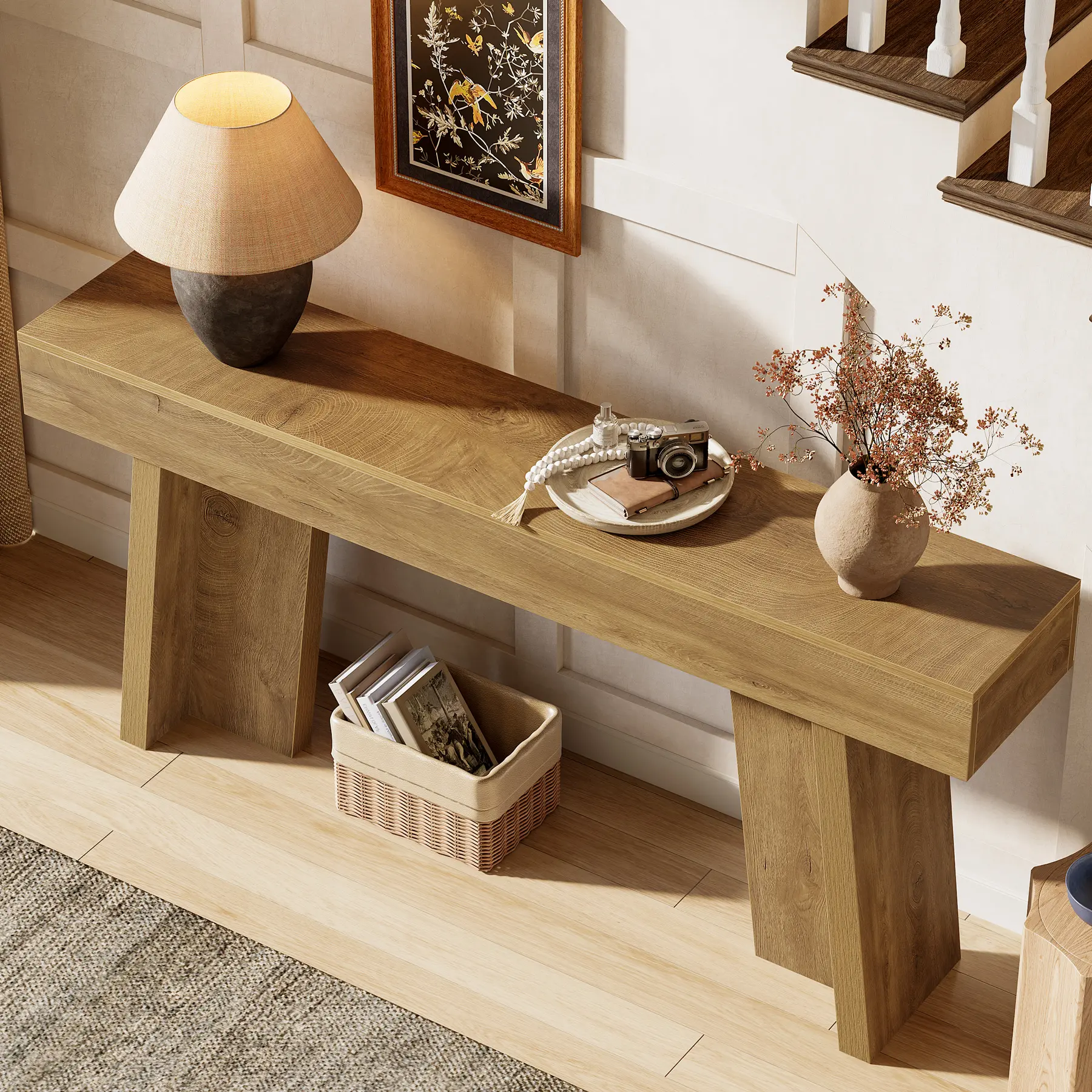 ·Farmhouse Entryway Table: Featuring a natural wood-grain finish and all-wood aesthetic, this console table delivers rustic charm for your foyer, hallway, or entryway. Its warm, country-inspired look enhances your home's cozy ambiance