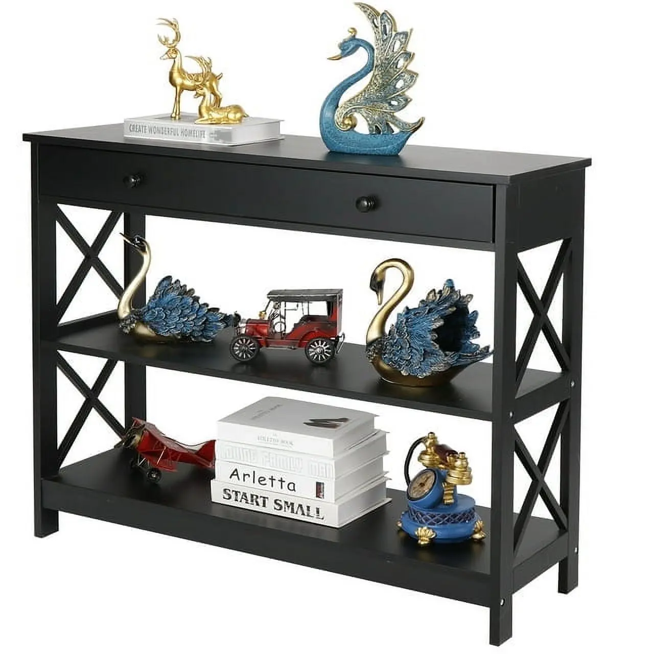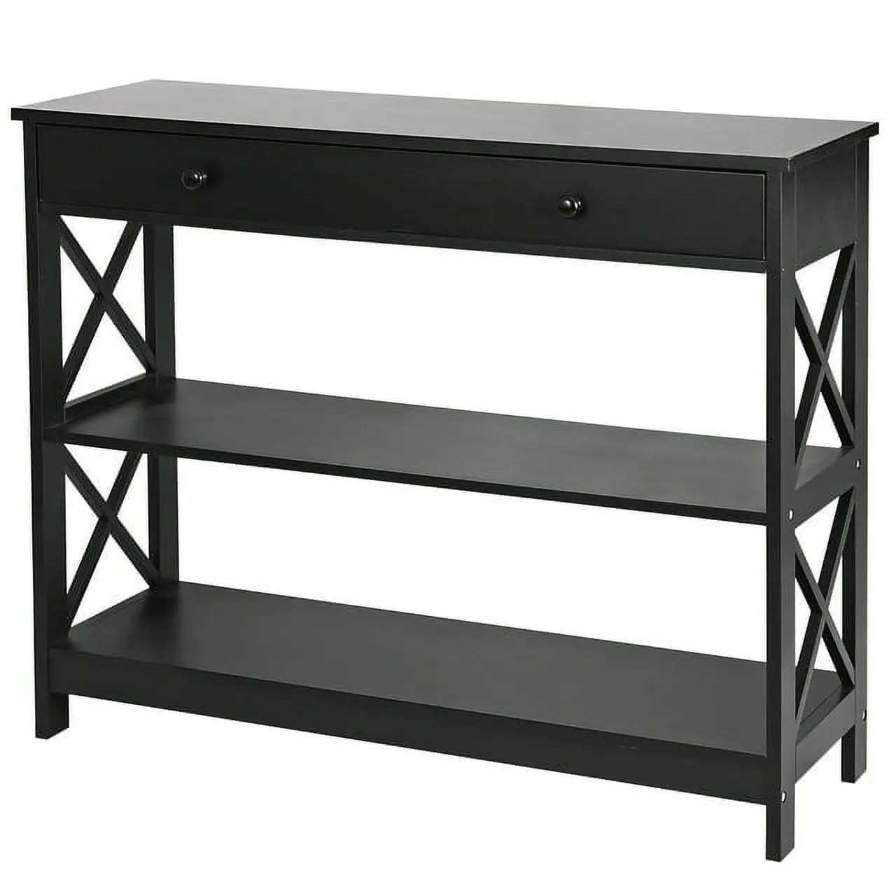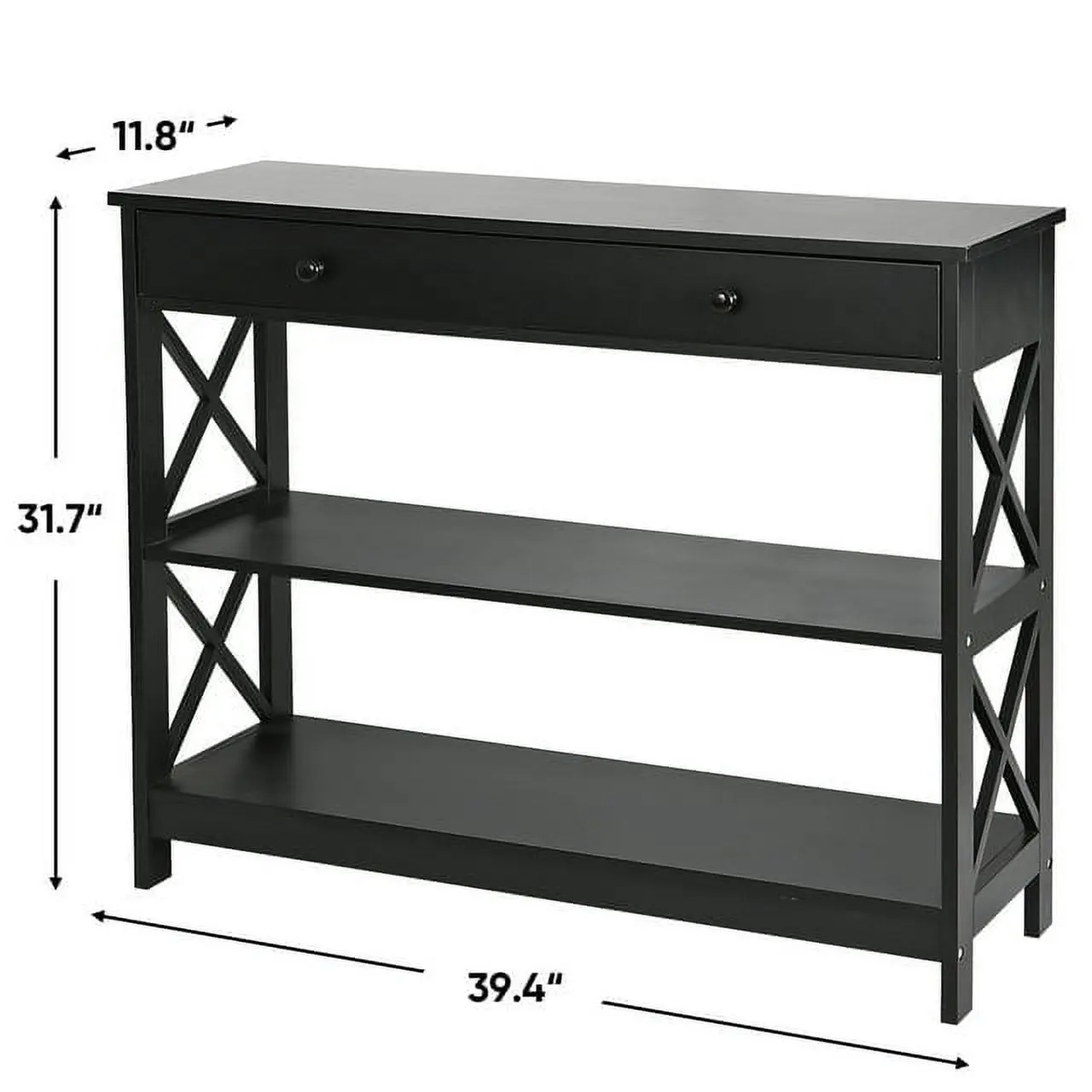 This console table is made of premium and solid MDF boards with a high-quality black powder coating that offers superb durability and stability for long-term use. Up to 55 pounds weight capacity of each shelf and the drawer is 22 pounds, let you can store and display a lot of items on it with no problem. The spacious drawer offers plenty of room to stow away entryway essentials and everyday necessities. A smooth yet textured espresso finish with its X design on the sides makes this accent entry table looks so elegant, let you be attracted by it.
