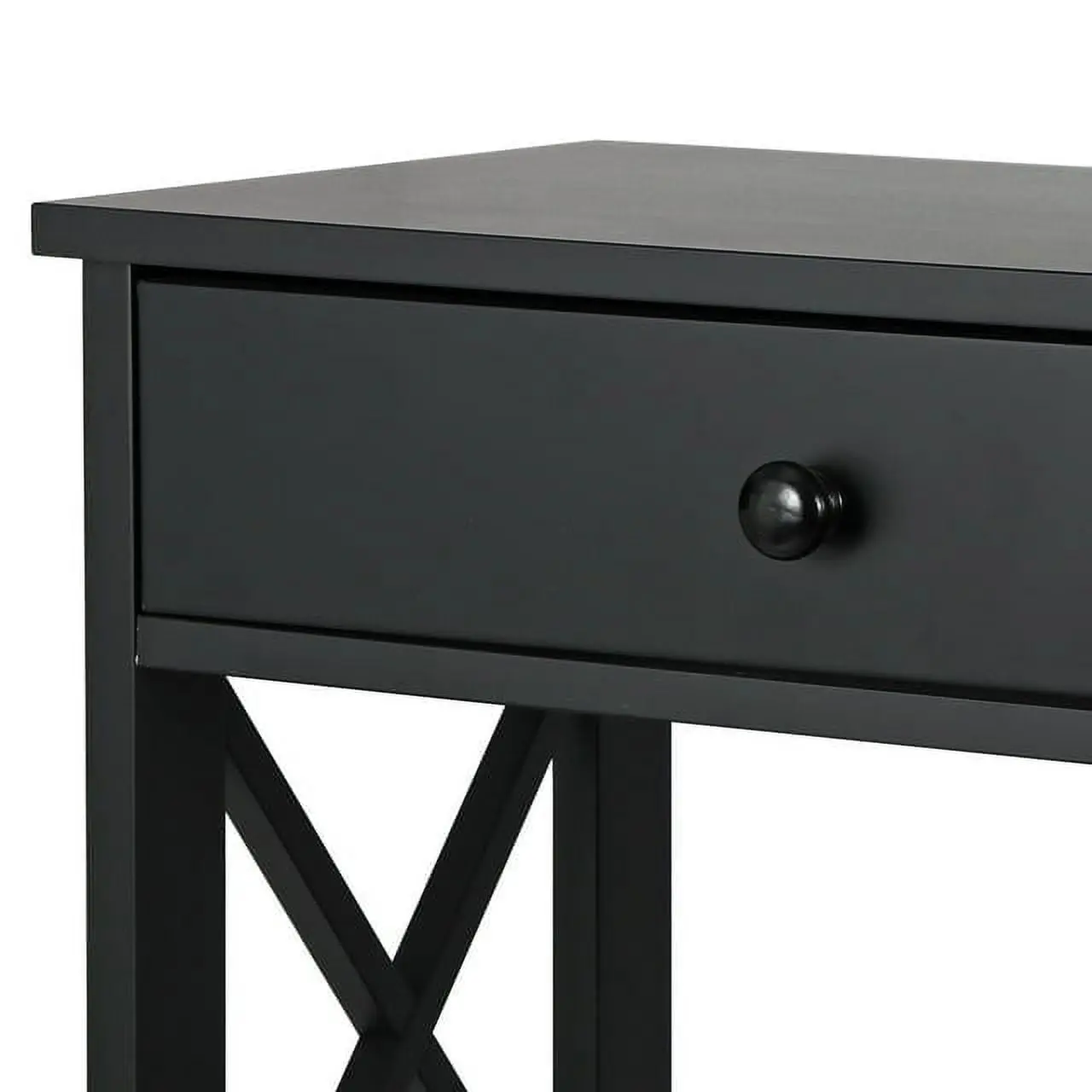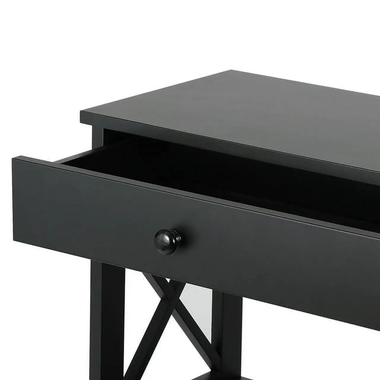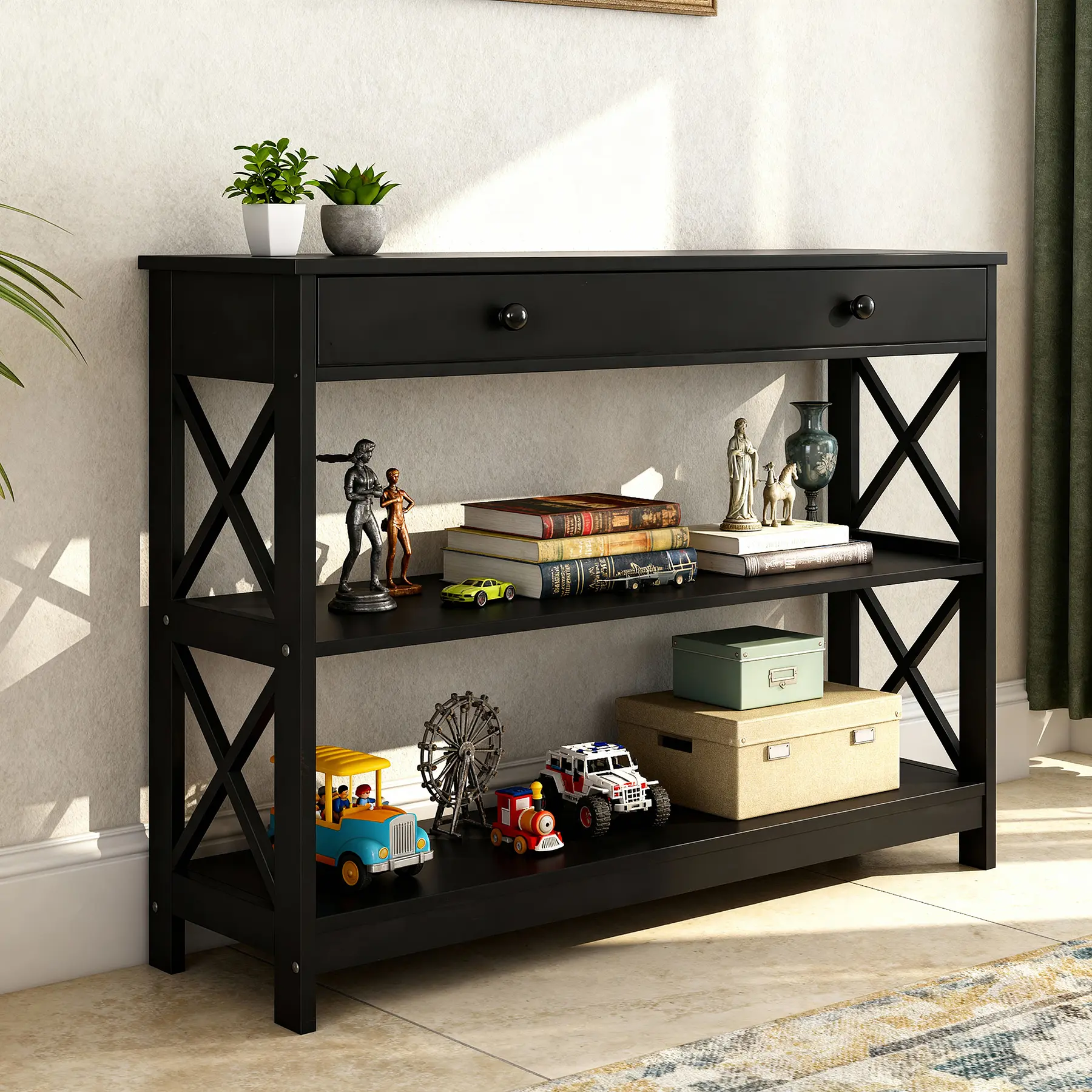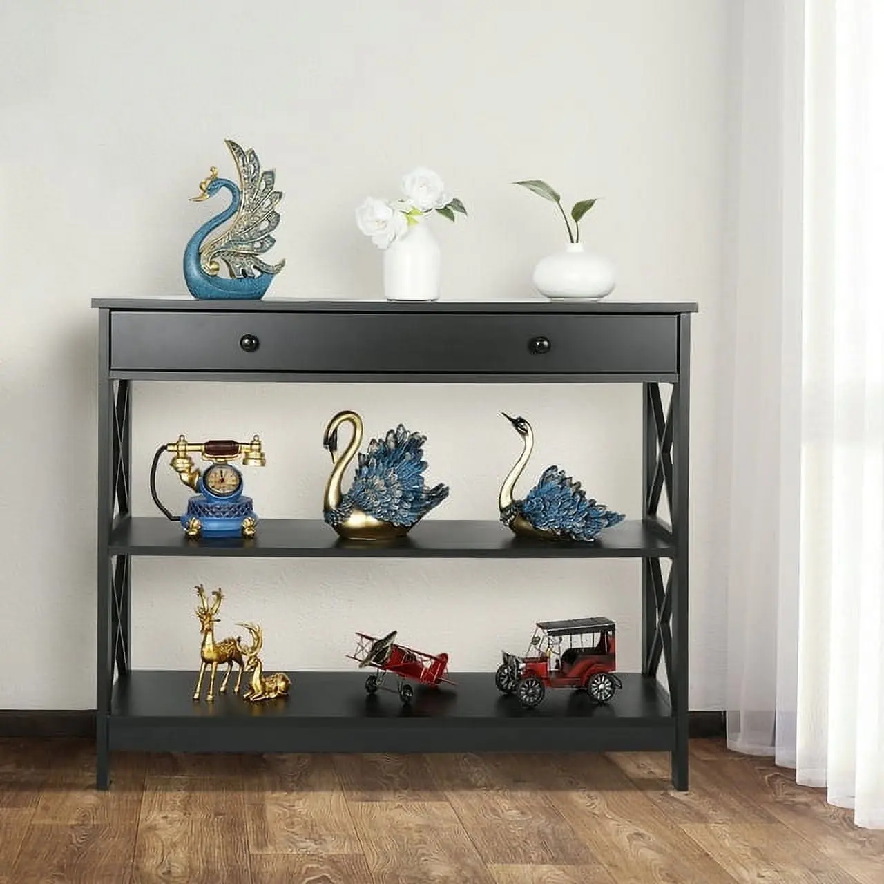 This console table is made of premium and solid MDF boards with a high-quality black powder coating that offers superb durability and stability for long-term use. Up to 55 pounds weight capacity of each shelf and the drawer is 22 pounds, let you can store and display a lot of items on it with no problem. The spacious drawer offers plenty of room to stow away entryway essentials and everyday necessities. A smooth yet textured espresso finish with its X design on the sides makes this accent entry table looks so elegant, let you be attracted by it.