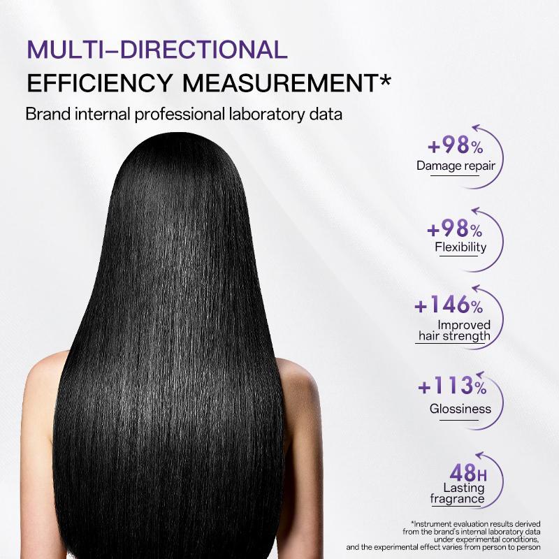 🌿 French Jinshan Thermal Water at 99% purity hydrates hair quickly. Amitro R Dihydroxypropyl Arginine Salt prevents drying and static electricity. Hydrolyzed Sweet Almond Protein builds a protective barrier. Moroccan Argan Oil and French Marula Oil enhance shine and texture. These ingredients deeply nourish hair.