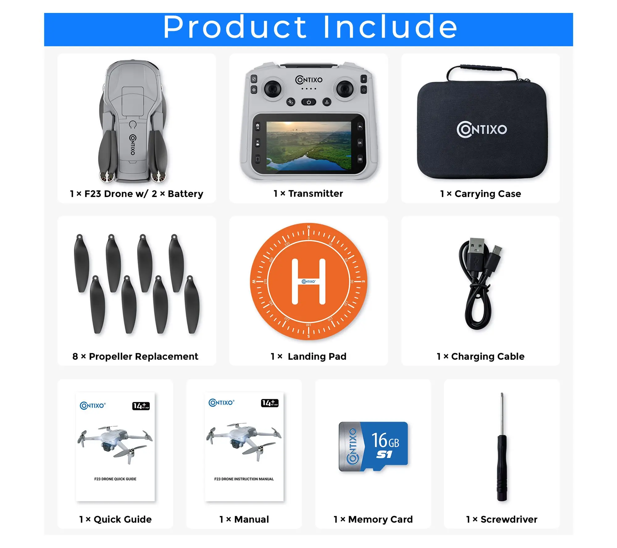 Ever dreamed of capturing breathtaking aerial views without complicated setups? The Contixo F23 drone makes it easy and fun! With a sharp 1080P HD camera and a built-in 4.5" screen on the controller, you get real-time FPV footage without needing your phone. Whether you're hiking, exploring, or just having fun in the backyard, this mini quadcopter’s GPS and optical flow technology keep your flight smooth and steady. Enjoy smart flight modes like follow-me, circle flying, and route planning to get creative shots effortlessly. The compact design fits right into the included carrying case, making it your perfect travel buddy. The package includes everything you need: drone, transmitter, spare propellers, landing pad, charging cable, memory card, manual, and screwdriver. Whether you’re a beginner or a young pilot aged 8 to 12, this drone offers a friendly, exciting flying experience. Ready to elevate your adventures? Grab your Contixo F23 and start capturing memories from the sky today!