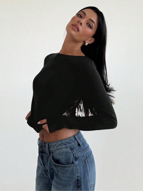 Women's Plain Contrast Lace Backless Tee, Elegant Fashion Casual Long Sleeve T-shirt for Daily Outdoor Wear, Ladies Clothes for Spring & Fall