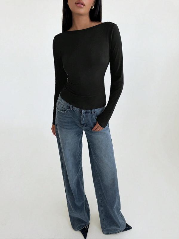 5. Women's Plain Contrast Lace Backless Tee, Elegant Fashion Casual Long Sleeve T-shirt for Daily Outdoor Wear, Ladies Clothes for Spring & Fall