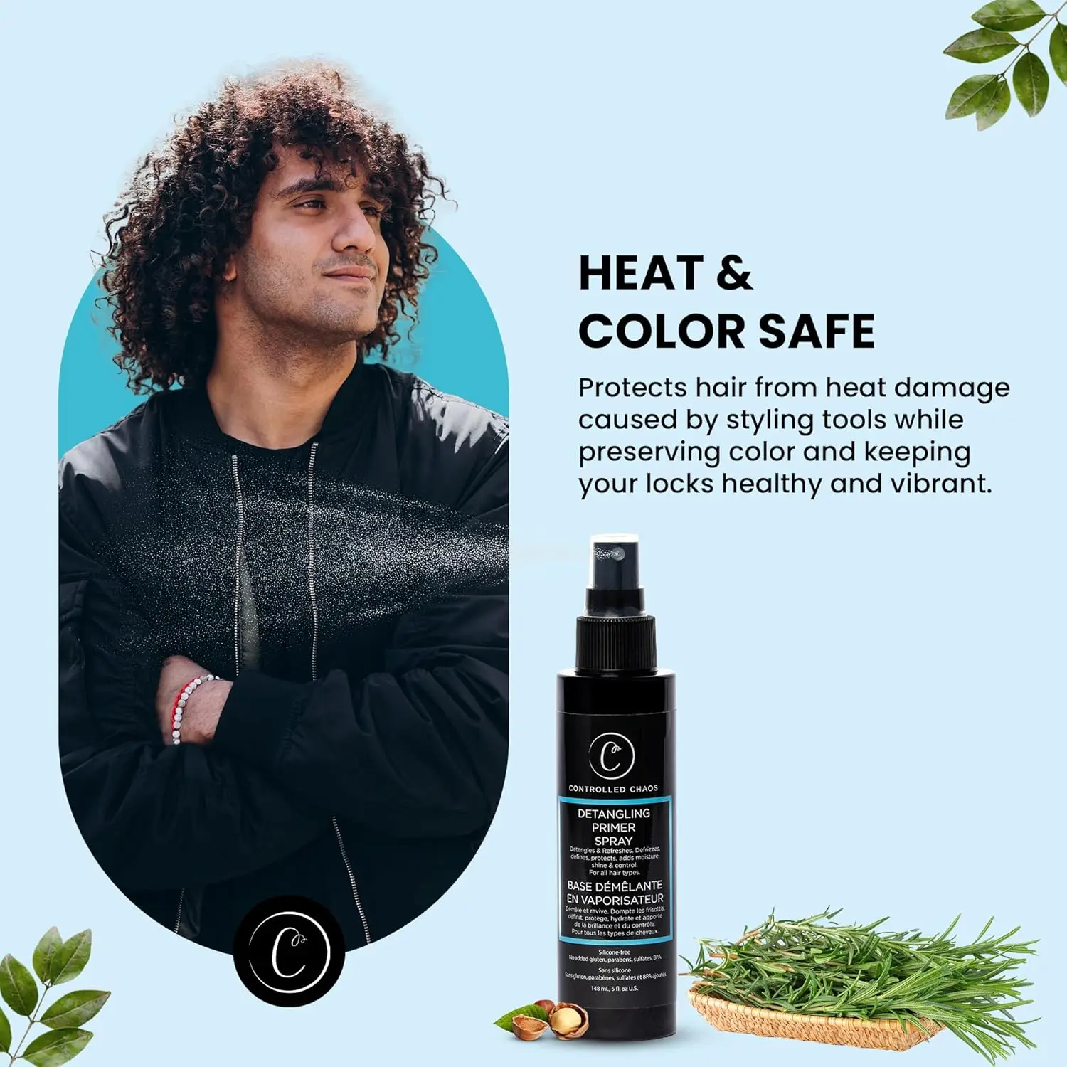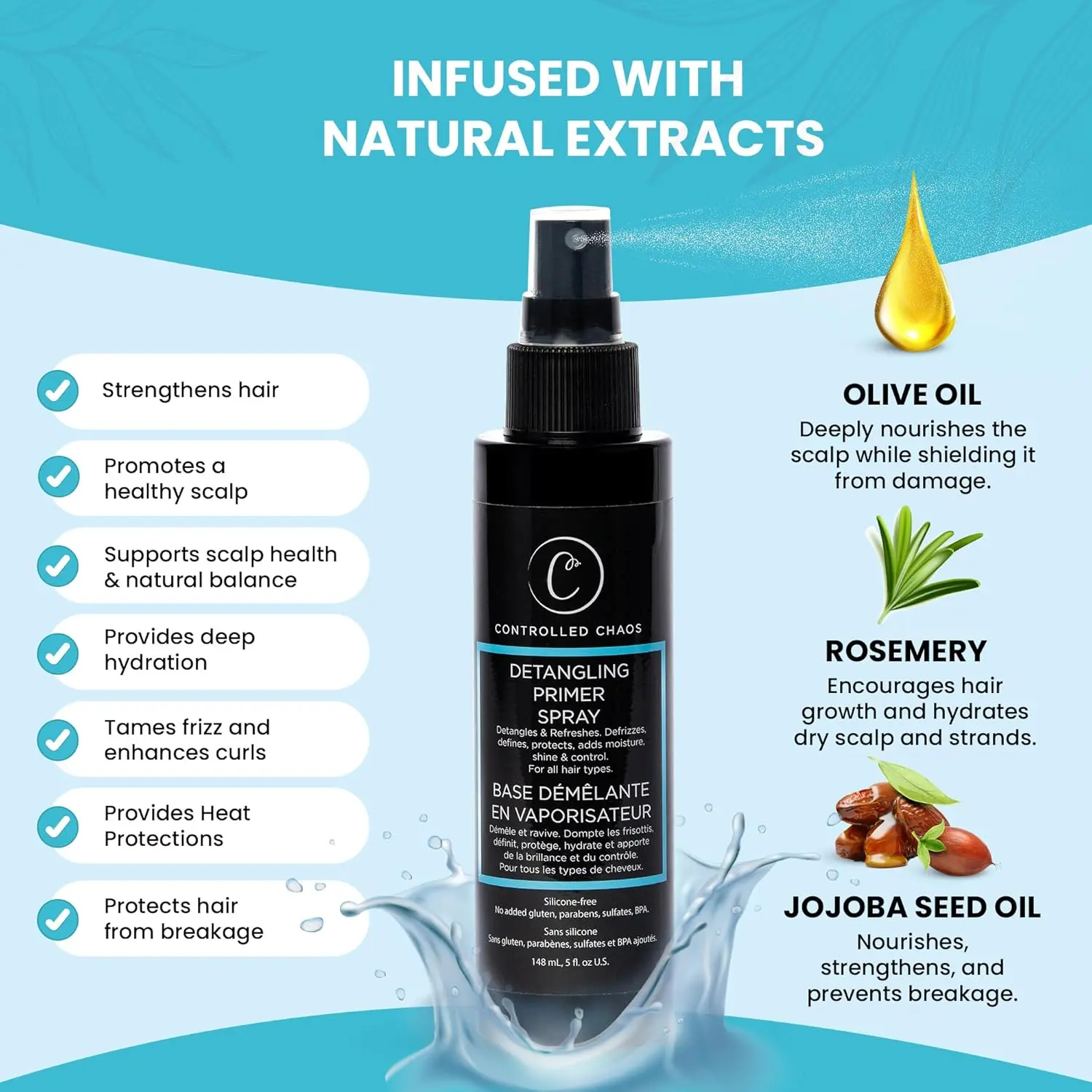 ·Infused With Natural Extracts: Enriched with organic extracts like Rosemary, Jojoba Oil, & Olive Oil, our curl detangler spray helps effortlessly smooth out knots, reduce frizz, and nourishes hair. It enhances manageability and provides hydration, leaving hair soft, shiny, and easy to style. Free of sulfates, gluten, parabens, silicones, and other harmful chemicals.
