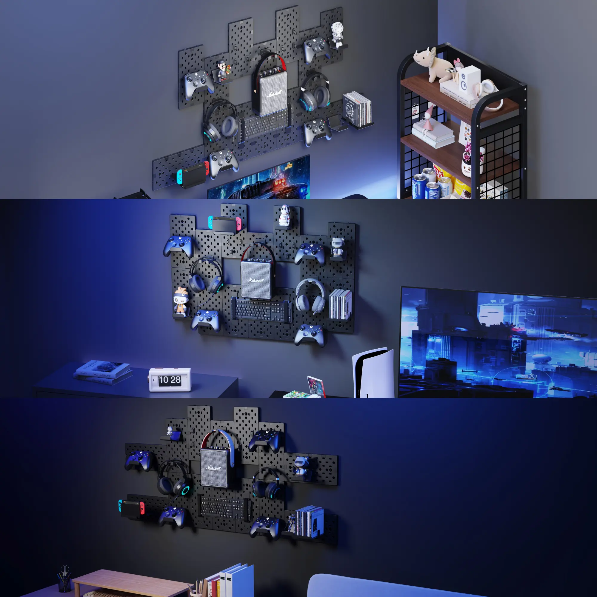 Modular Design for Custom Gaming Setup: Build your ideal gaming setup with this fully customizable modular pegboard. Connect panels with fasteners to create a layout that suits your space and style, whether for organizing gear or showcasing your collection. This pegboard for gaming setup adapts to your needs. Durable and Strong: Made from high-quality materials with a textured finish, Our gaming pegboard supports up to 33lbs, offering solid stability for all your gaming essentials.