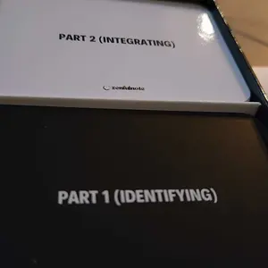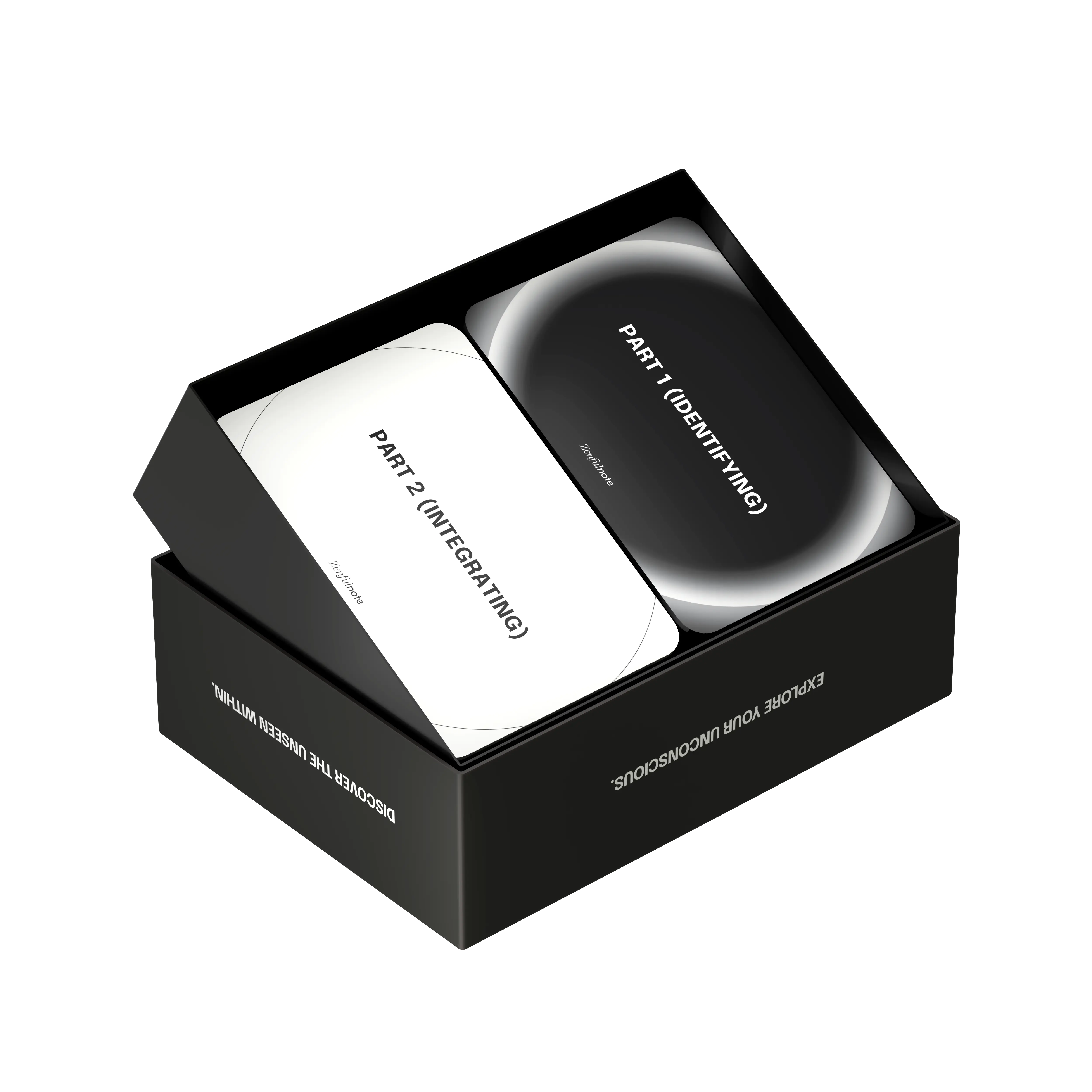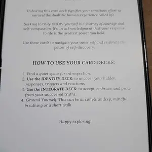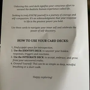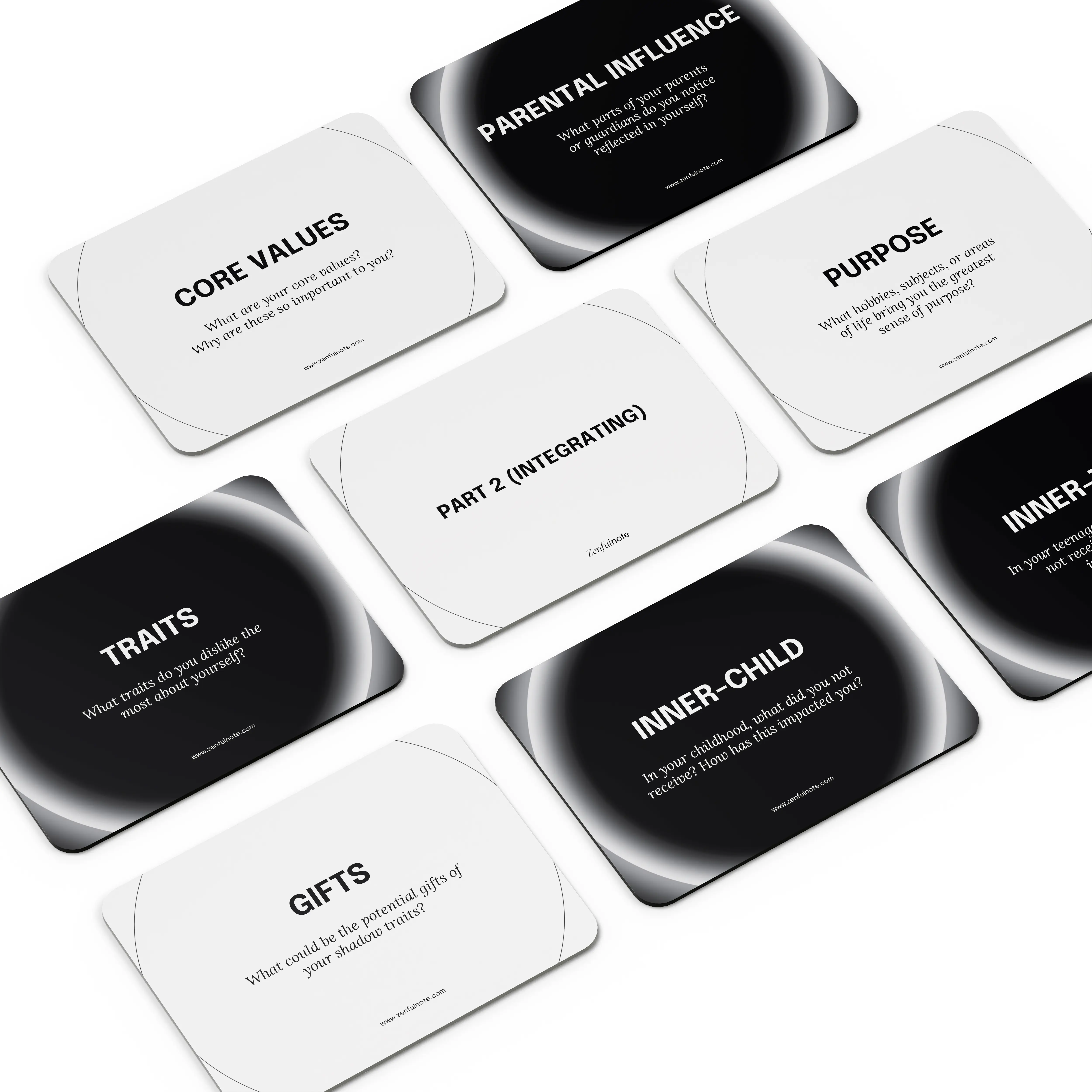Deck 2 - Integration: Transitioning from identification, the second deck guides you on a journey of acceptance. Its prompts aid in the understanding and assimilation of the aspects unearthed in Deck 1.