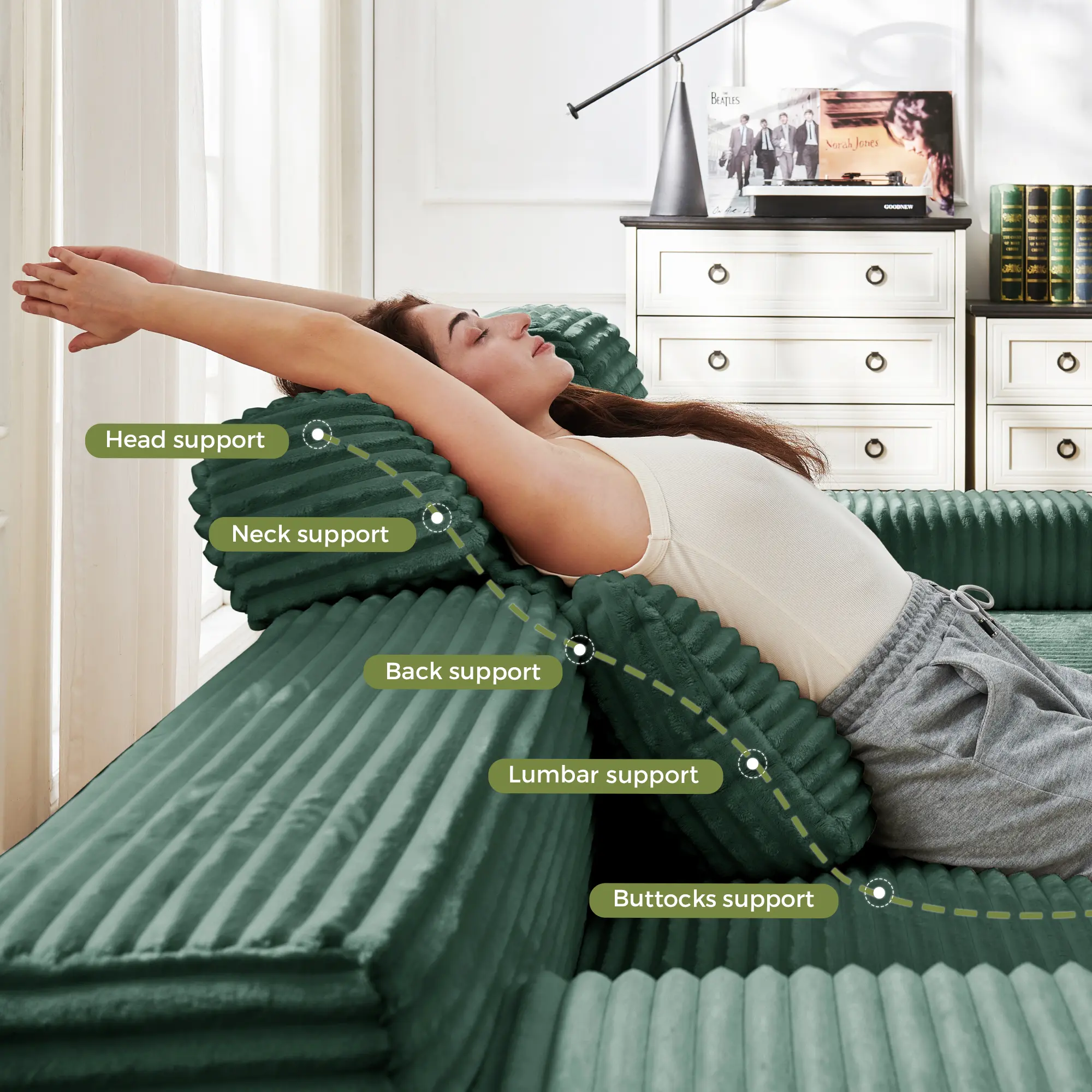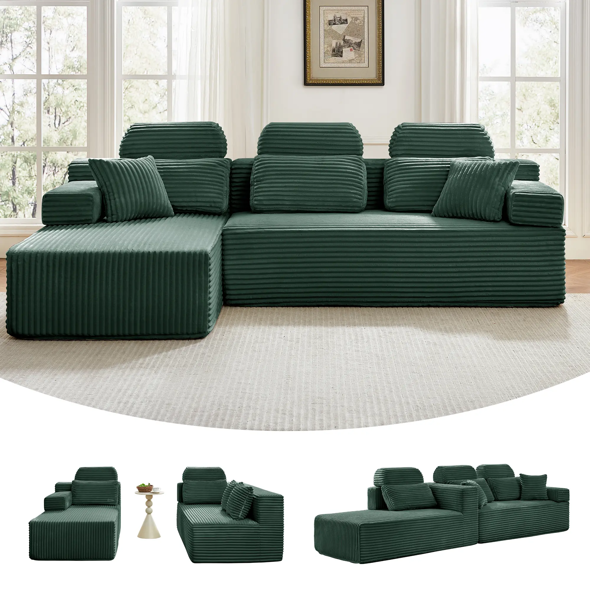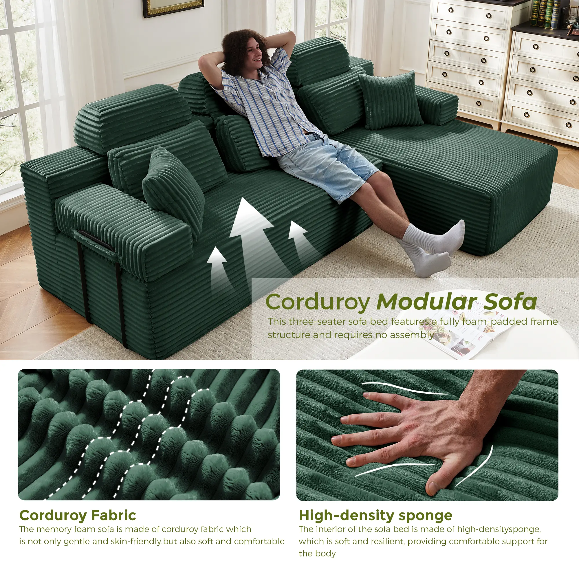 ·High-Density Foam: The modern boneless sofa is made entirely of high-density foam, with no wooden frame inside. It has good breathability, resilience, and a long service life. The high-quality corduroy fabric is soft, comfortable, and durable, with excellent stain resistance.
