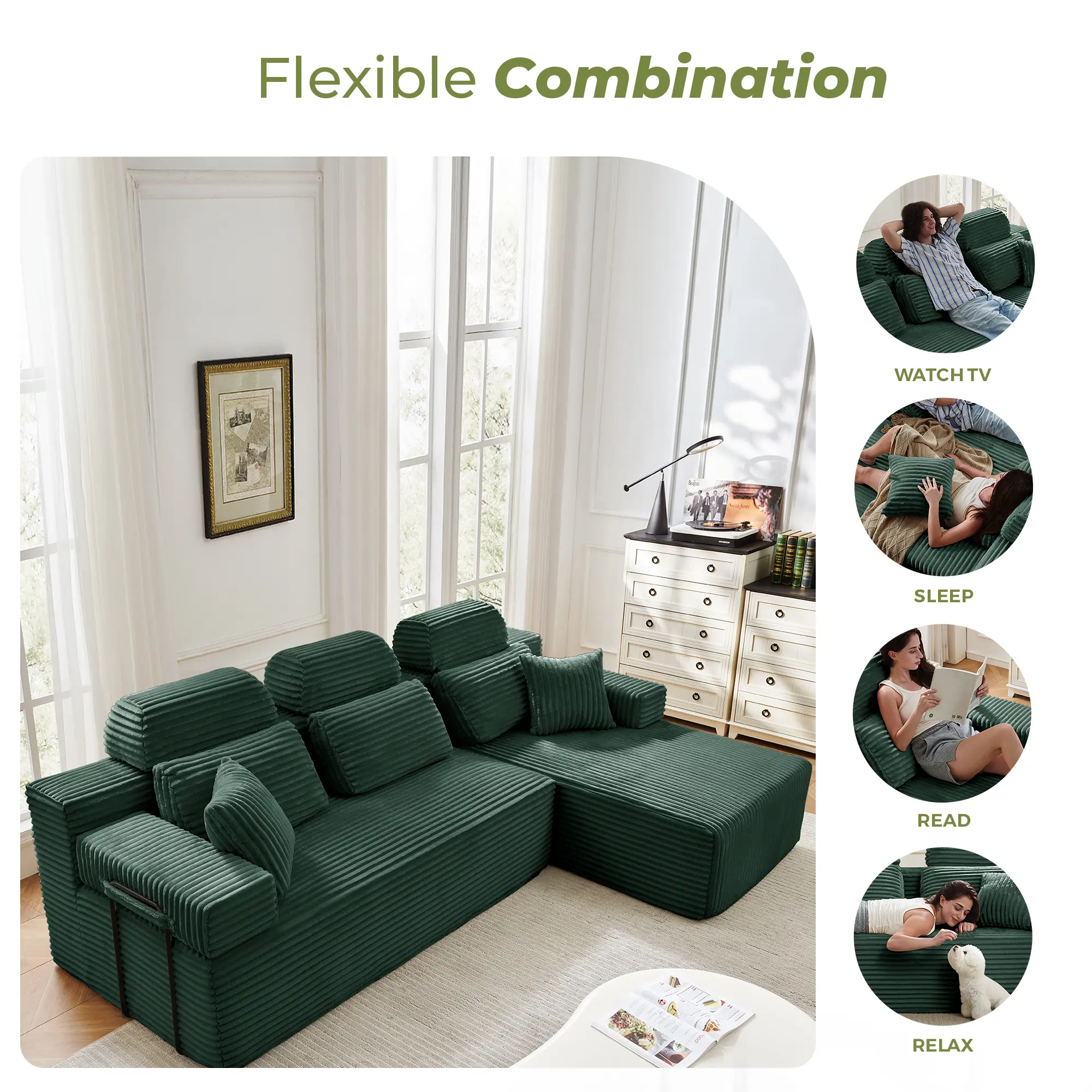 ·Dimensions: The modular sectional sofa has a 104-inch width, 28-inch seat depth, It offers unmatched comfort for long sitting periods.