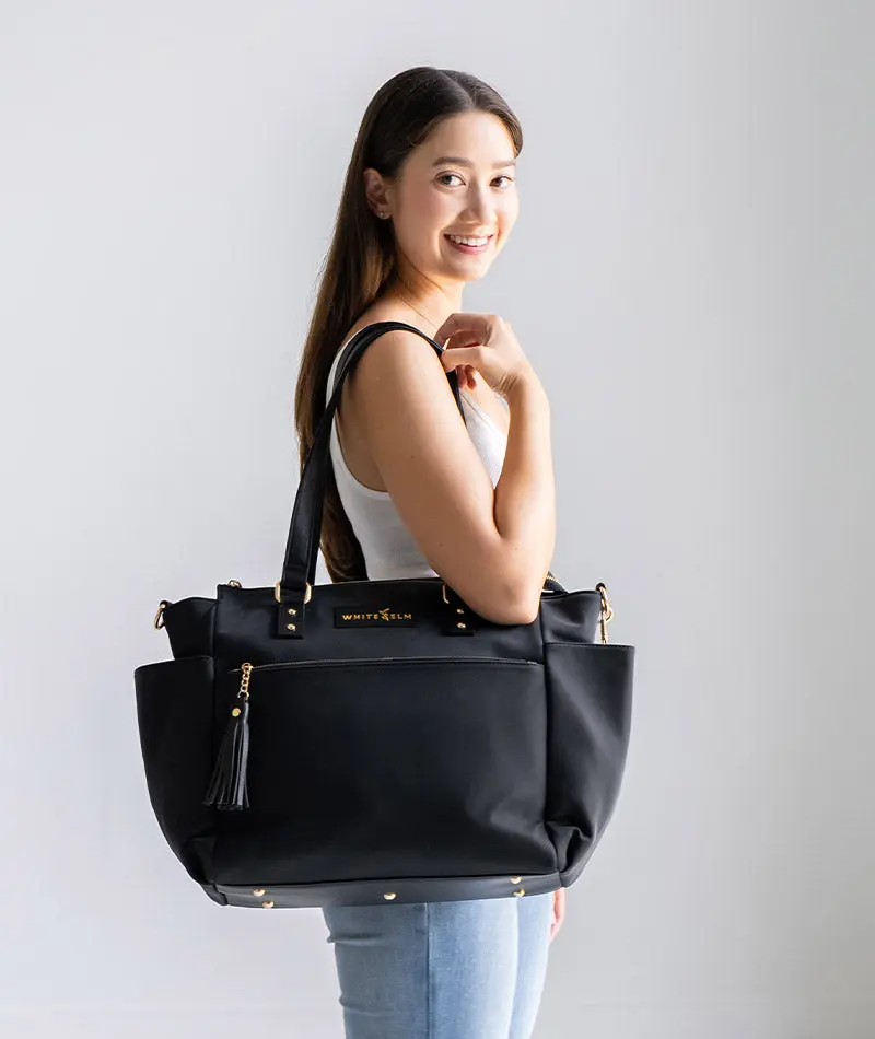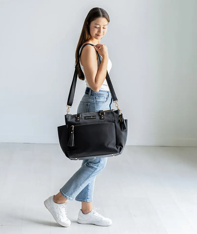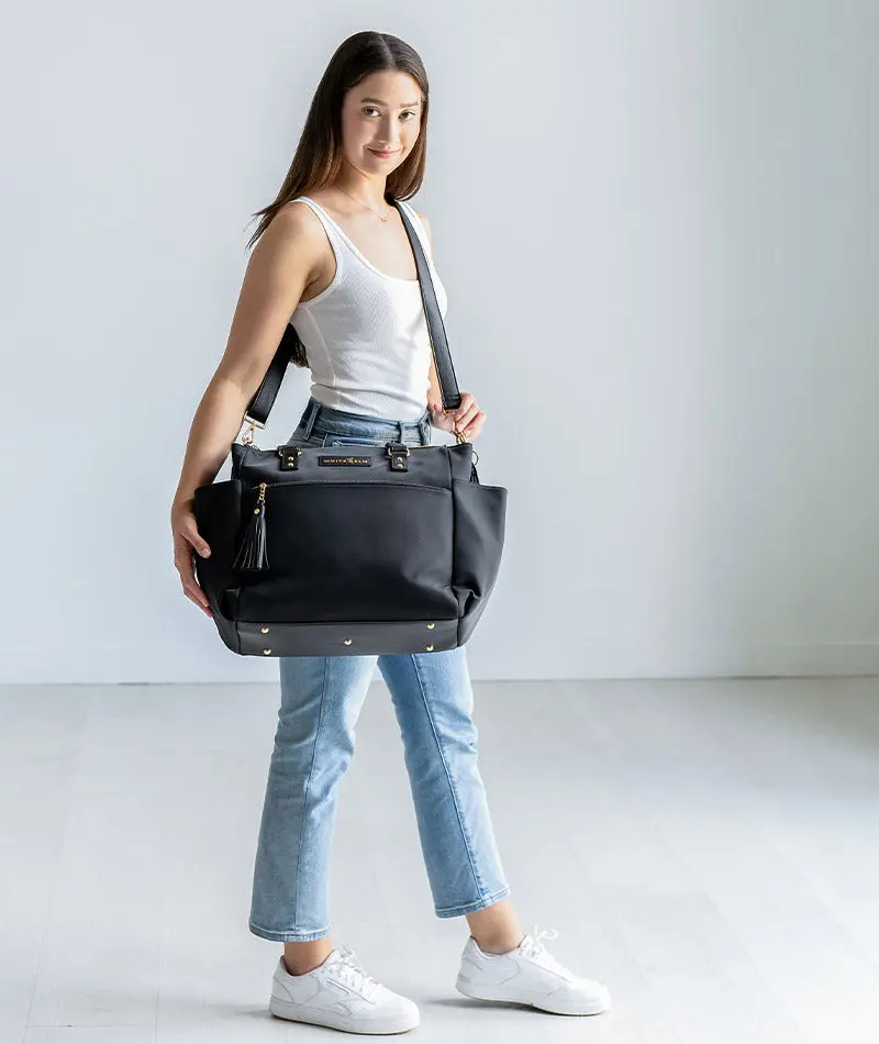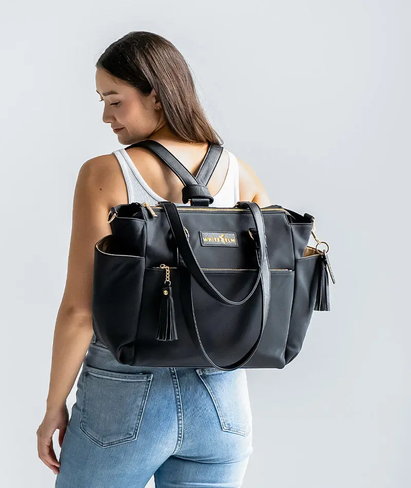 I was juggling a purse, lunch box and diaper bag some days but no longer! I can fit a couple diapers and a portable wipes case, my water, my lunch box, my purse essentials and computer. And the fact that I can easily wear it on my back or on my arm is super clutch when I'm getting two toddlers out of the car plus all their gear.