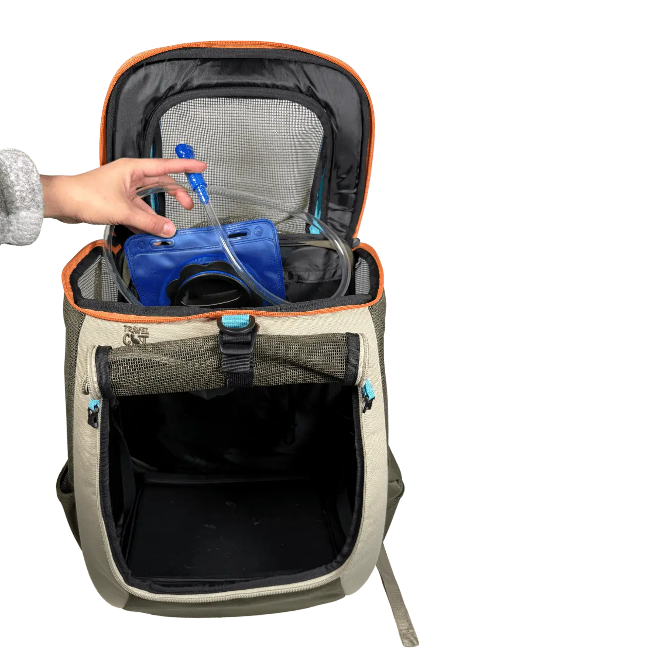 The backpack includes multiple storage pockets so you can bring everything your cat needs on the journey, including treats, supplies, or a water reservoir for longer outings. Flexible side pockets make it easy to carry water bottles or small essentials while keeping your hands free.