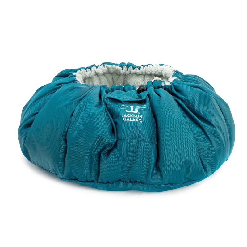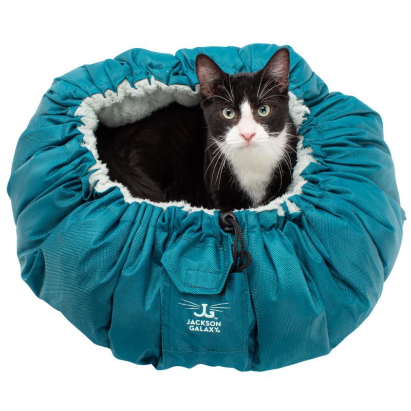 Jackson Galaxy's Convertible Clamshell Bed is the most versatile and convertible cat bed ever made! The Clamshell is essentially 4 beds in 1 and has been designed by Jackson with the comfort of every cat in mind! Lay it flat for a soft place to stretch out or pull the drawstring to make a cozy, safe bed your cat will nap in for hours. Test out any of the below variations to see which style of bed your cat prefers the most! How to Convert your Clamshell: Cinch up with gray plush side in -- during cold weather, cats enjoy the cozy snuggly warmth Cinch up with blue polyester side in -- still a nice hideaway for cats who like to scrunch into small places, but don't want it too warm Lay flat with gray plush side up -- a soft warm bed but without the sides Lay flat with blue polyester side up -- still soft and comfortable, but cooler to the touch