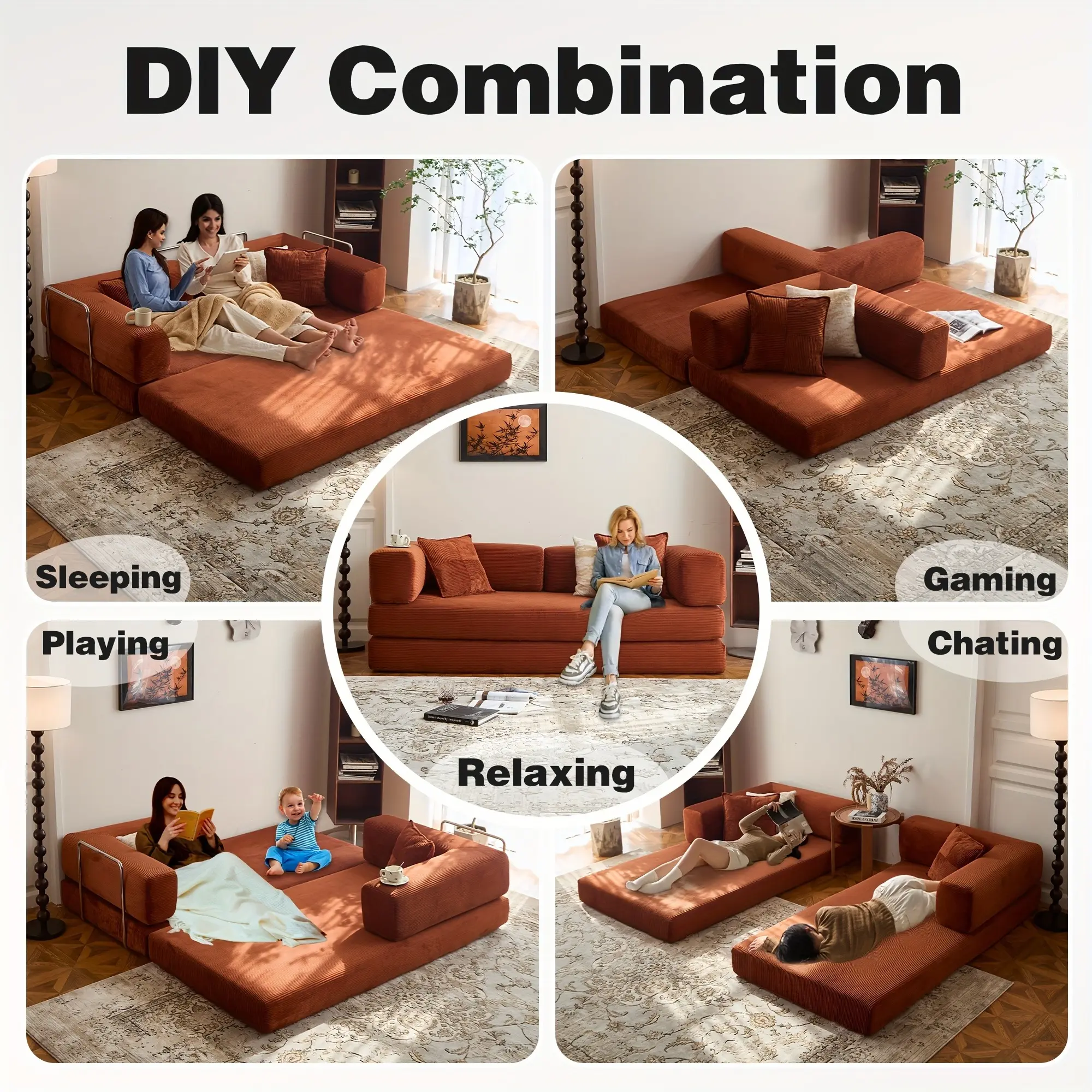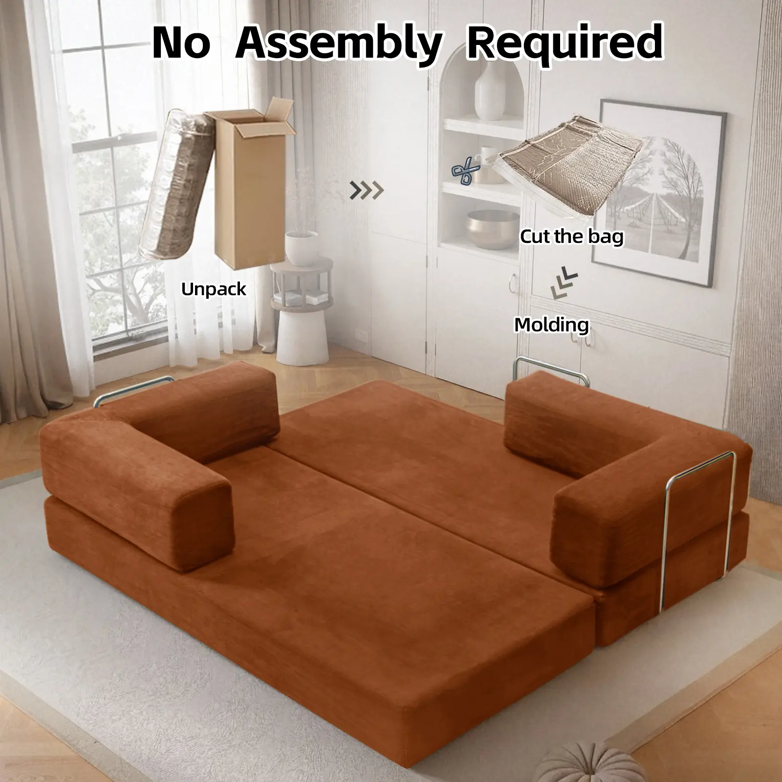 A normal person here: this couch is comfortable, yet solidly firm. It comes in a box that my female butt could drag into my apartment and set up. It's a really great burnt orange that matches my mid century modern apartment. I sleep on it and am 5'7 with room to spare.