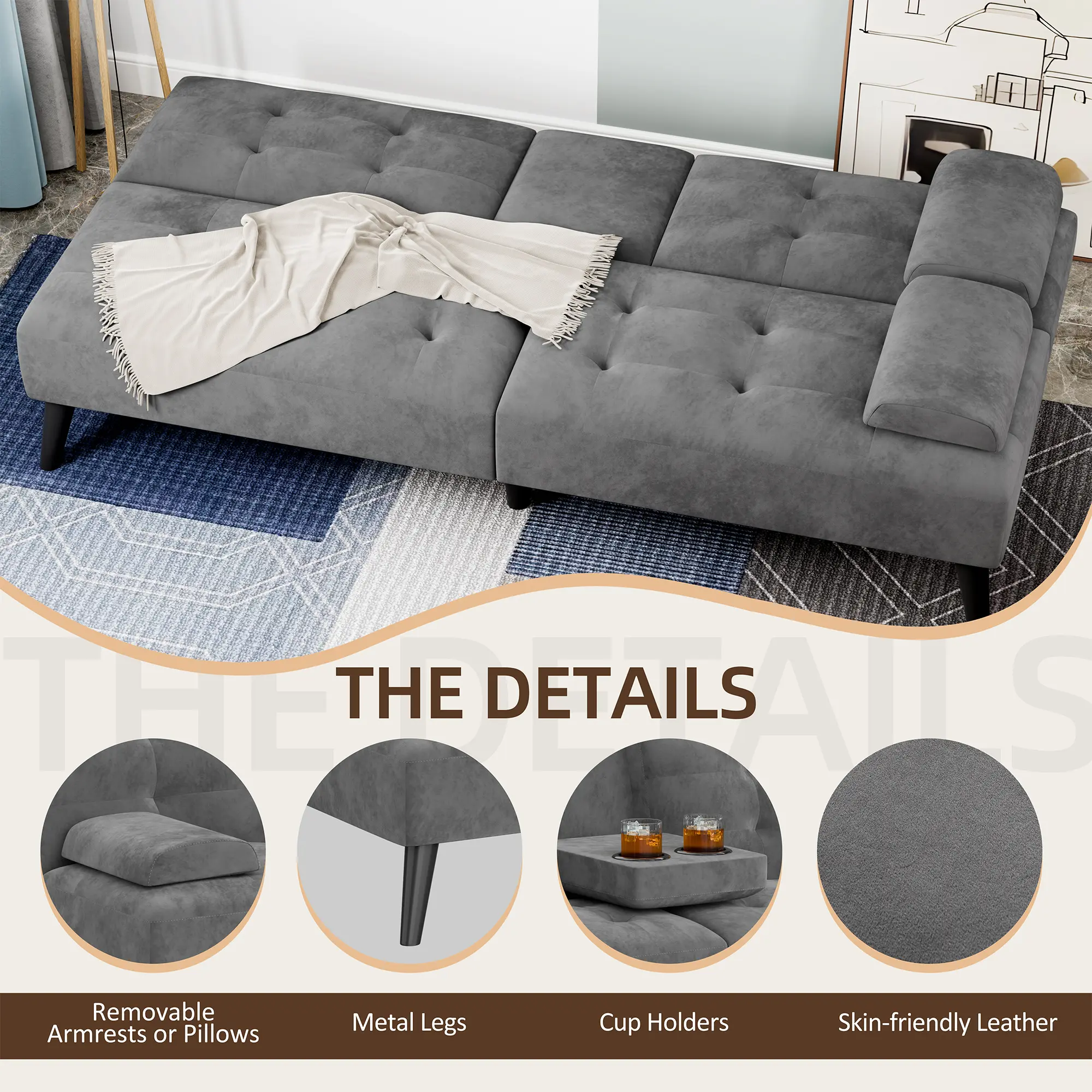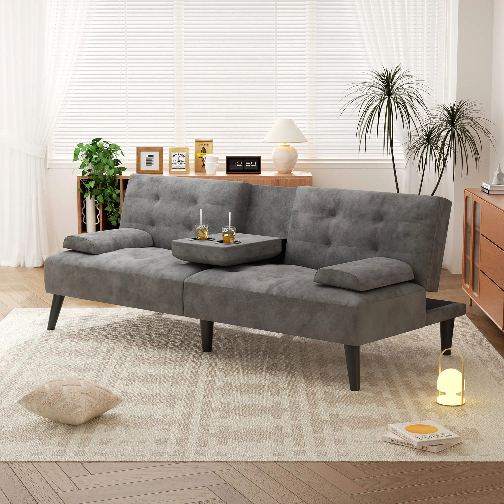 Thoughtful Design: This folding futon sofa bed is perfect for entertaining. The center armrest folds down and has two cup holders for chatting with friends on the futon sofa and enjoying a few drinks