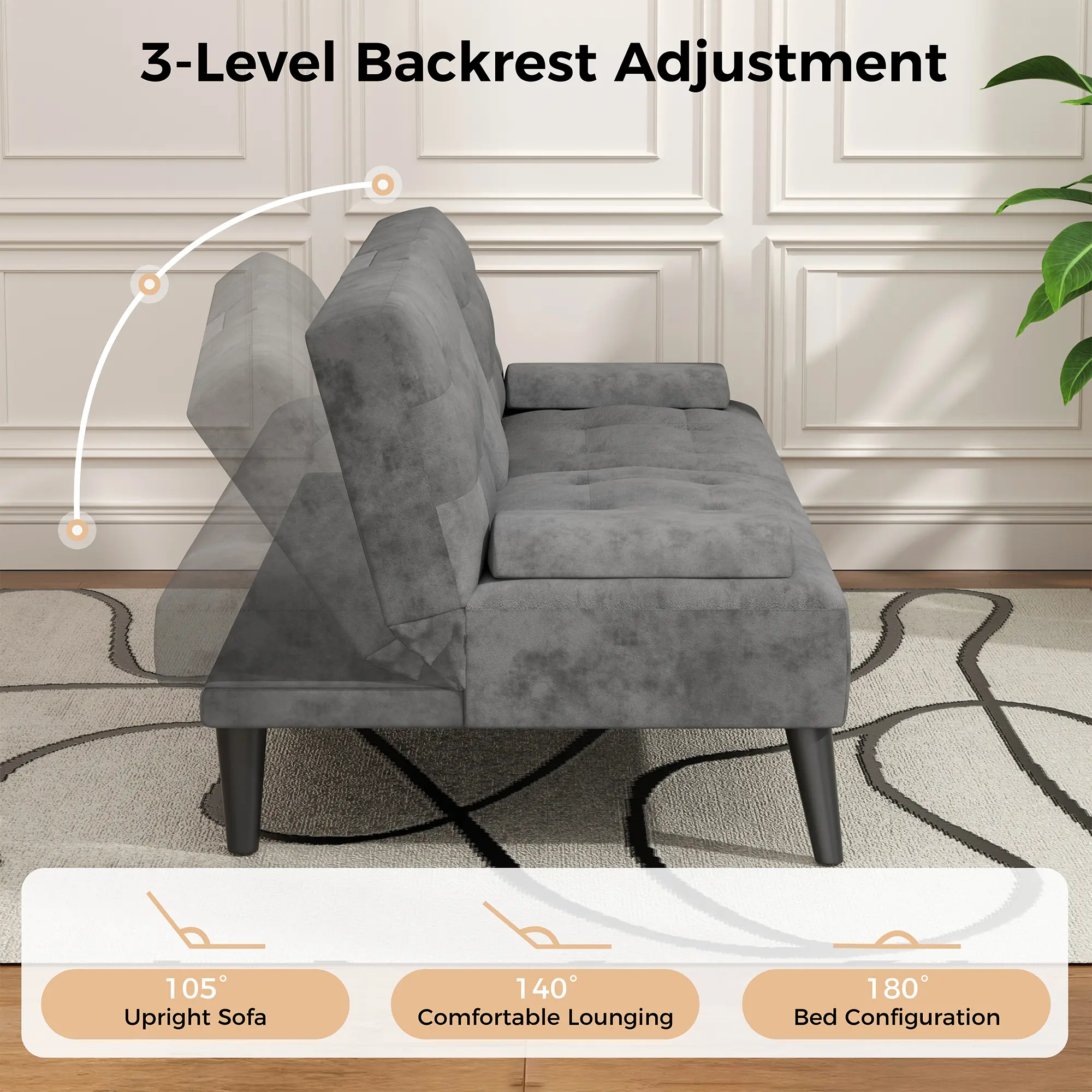 Adjustable Backrest: Folding futon sofa bed backrest can be adjusted in the range of 120°, 160° and 180°, different angles to suit different needs, in any situation you can simply adjust the angle for comfort