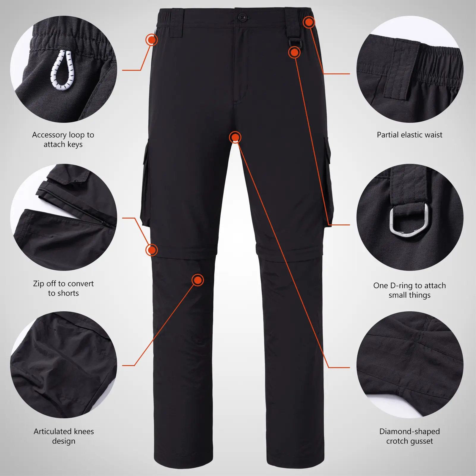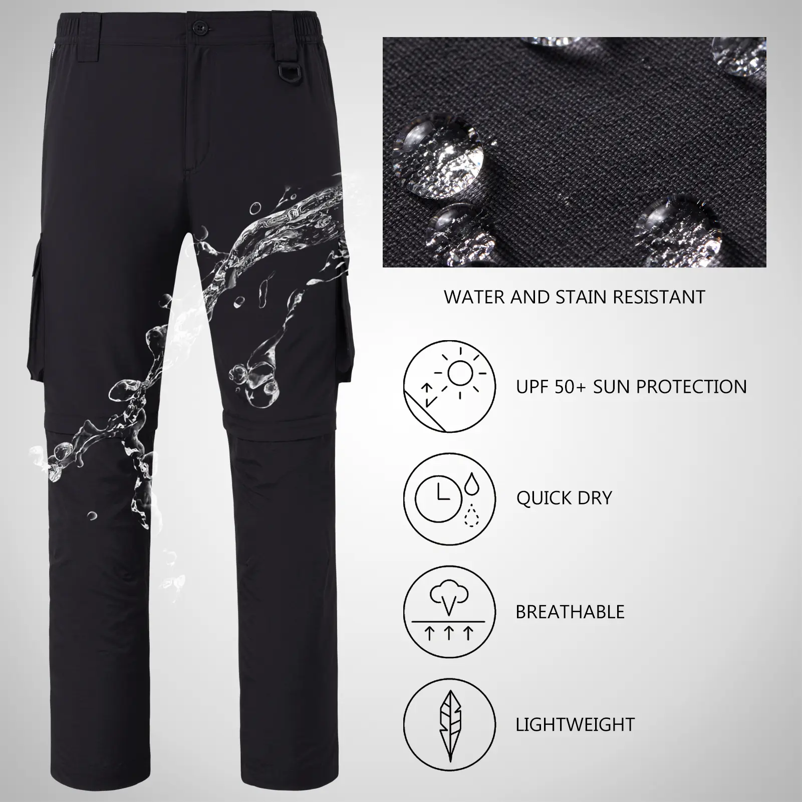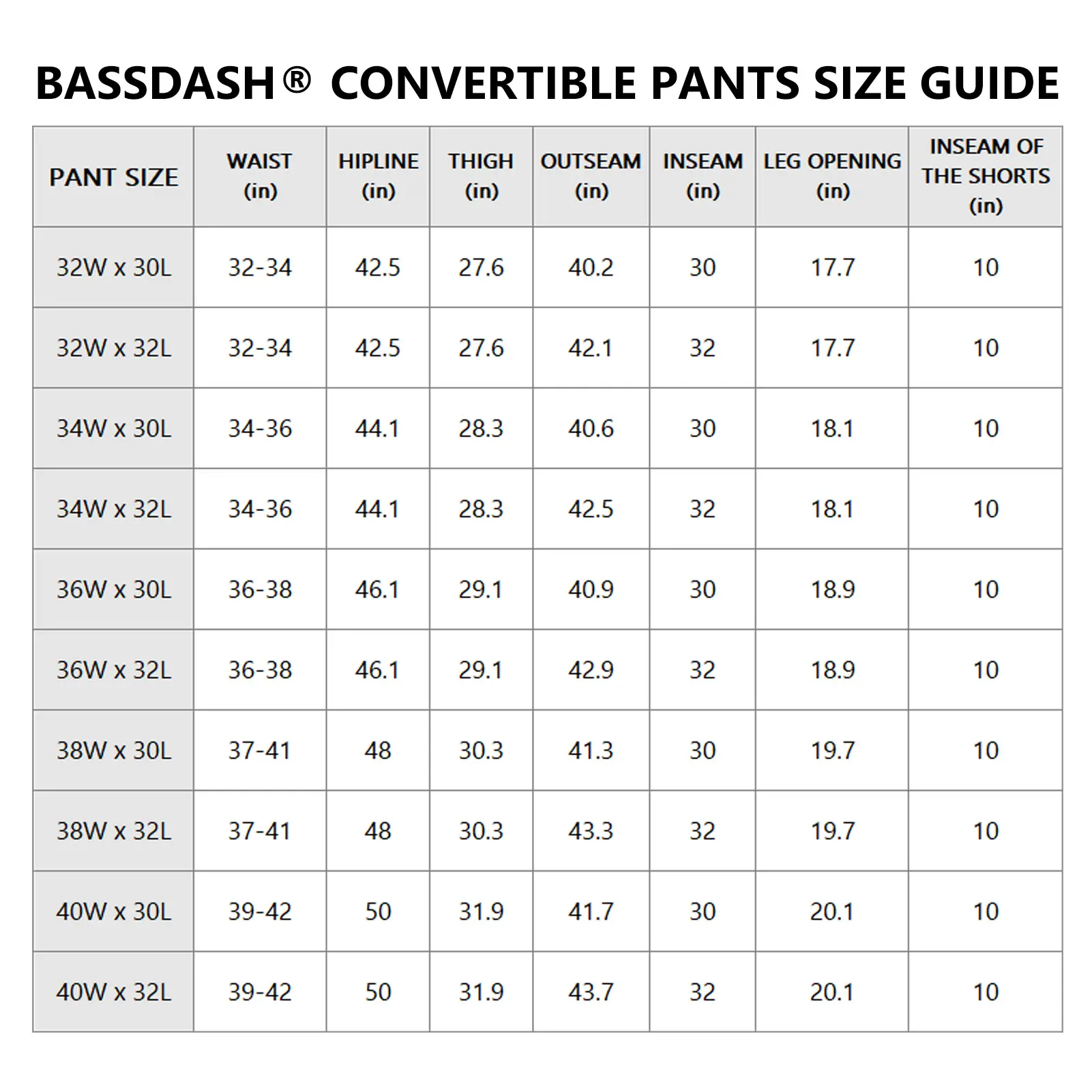 The convertible pants are featured with concealed zippers at the knees for an easy change from pants to10'' inseam shorts- you can zip off legs to convert the pant to a short when active in heat or as you like