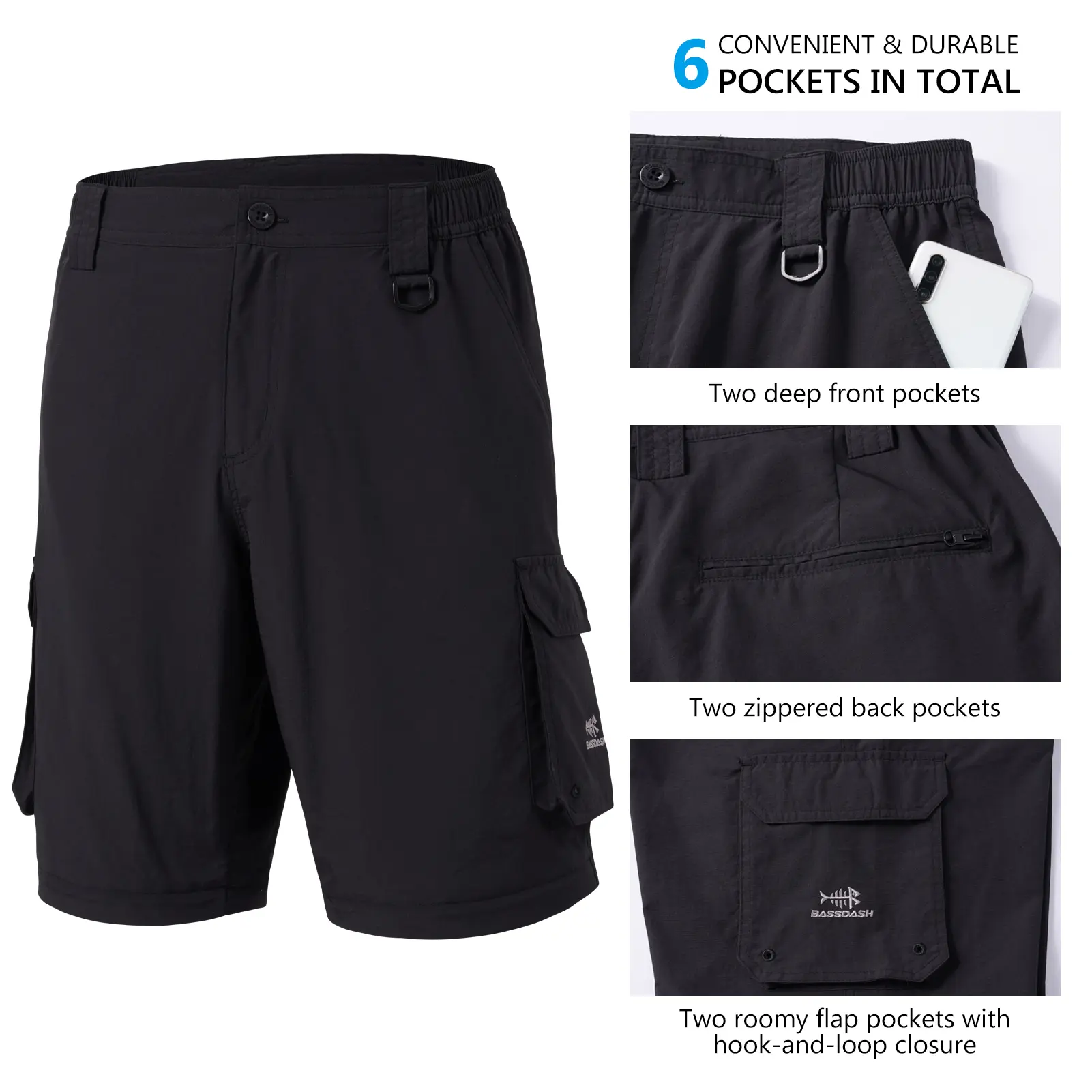 Six multi-purpose pockets for maximum storage capacity: two deep front mesh-lined pockets that allow to vent heat for added breathability, two SBS zippered back pockets for private items, two security cargo pockets with flap and hook-and-loop closure to meet your essential needs and quick access