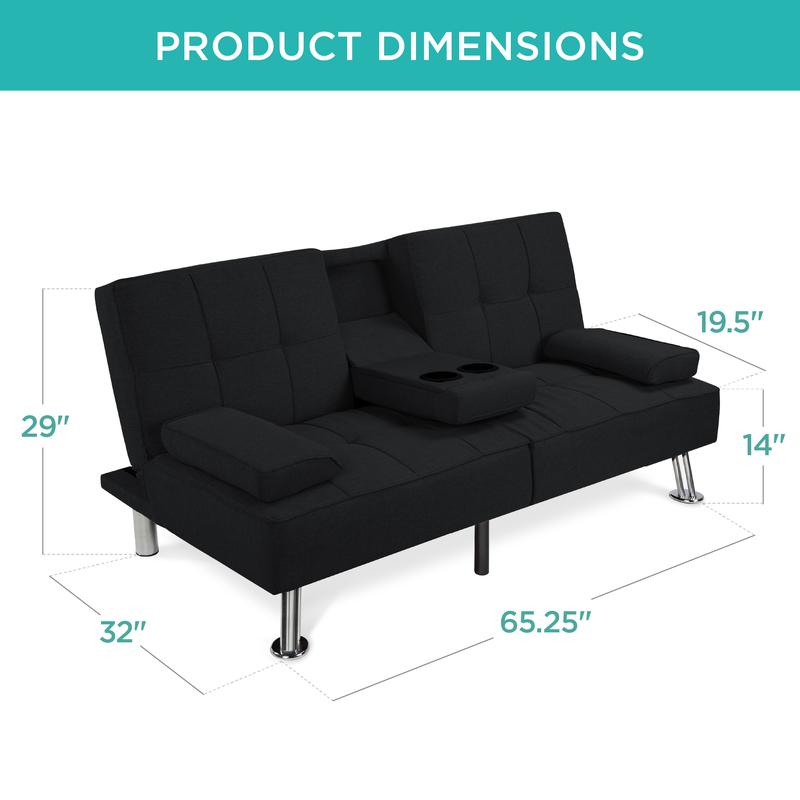 ROOM FOR 2: This stylish futon sofa has a 500-pound weight limit that lets you lounge in good company while utilizing a fold-down armrest with convenient cupholders in the middle