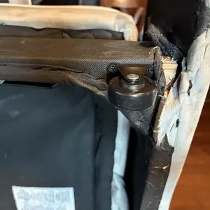 Right now it's on the middle. Delivery:box was all taped and looked like crap. There are some areas that the black fabric is torn, I cannot figure out where to put the rollers because I can't find any holes. Are there holes or are we supposed to make our own?? So haven't been able to enjoy the sofa.